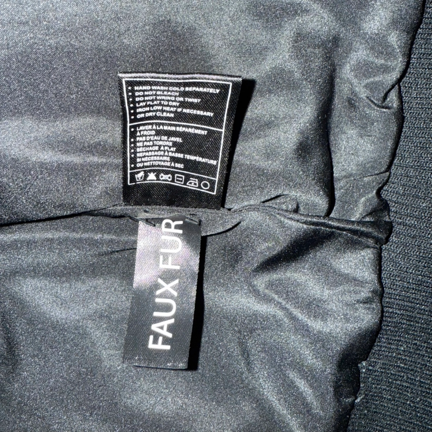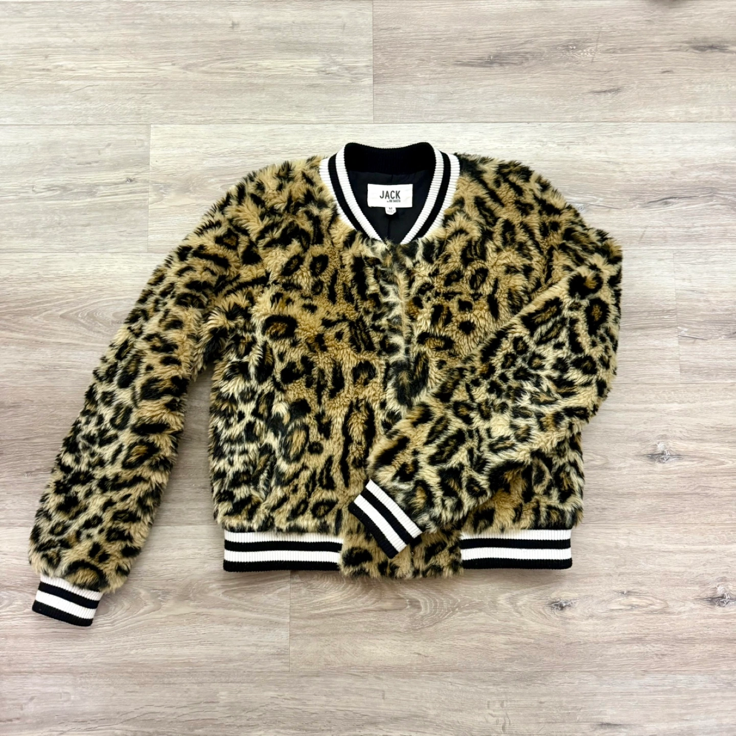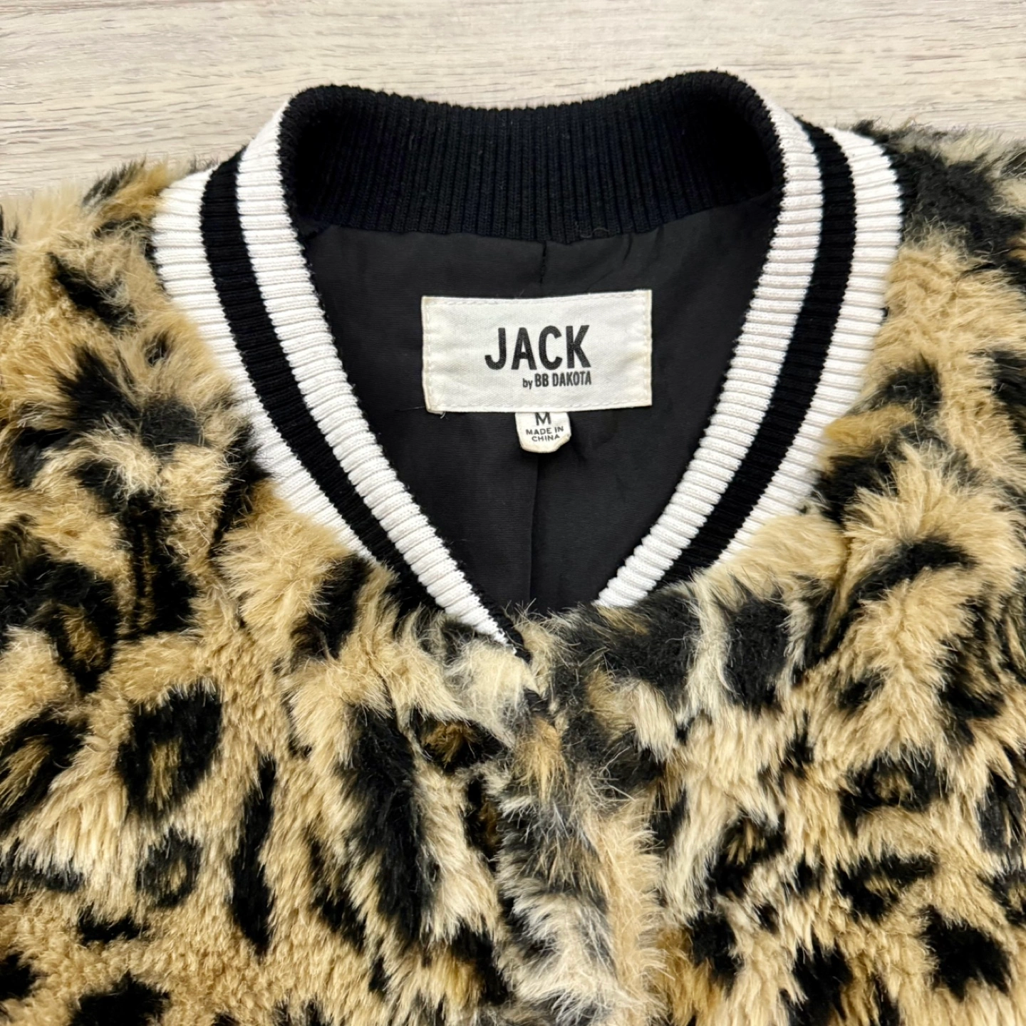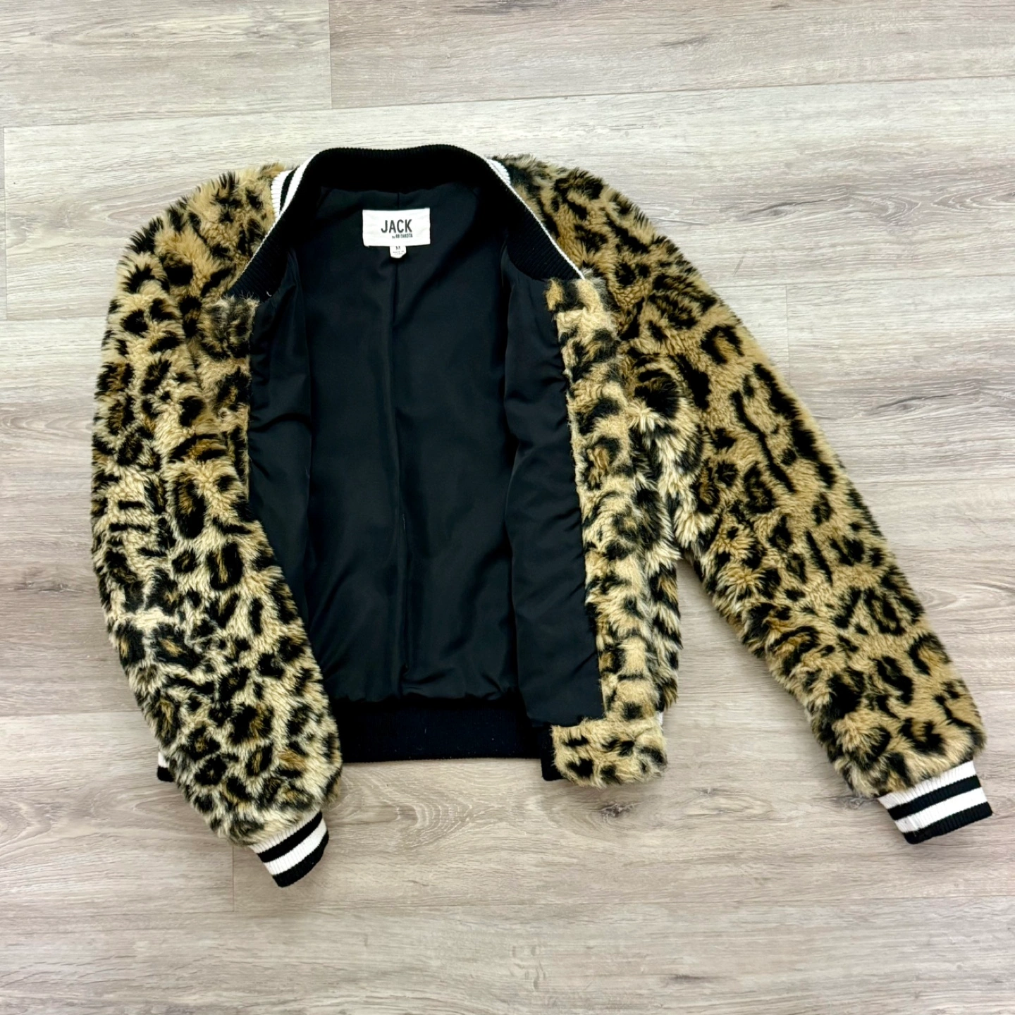44Women's medium faux fur bomber jacket. Leopard print. Black and white ribbed trim. Button closure. Soft and cozy.