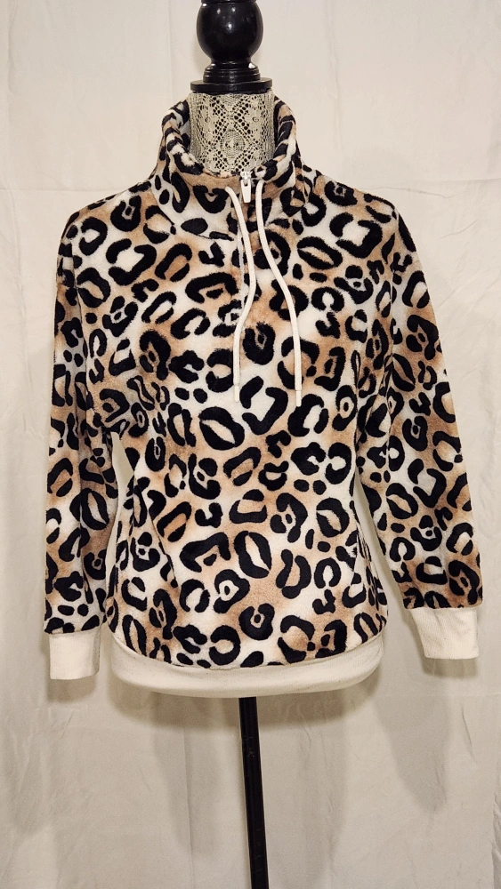 Soft and cozy pullover featuring a leopard print. Has a half zipper and a drawstring. Great for casual wear or lounging.