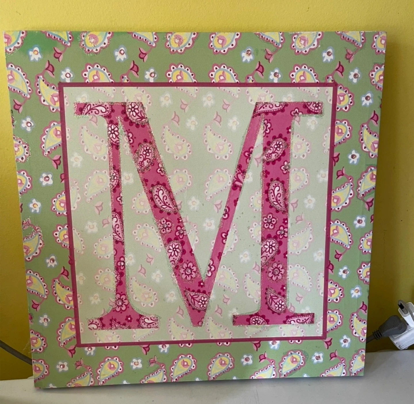 506Cute letter M wall art! It's in great shape and ready to brighten up any room. Perfect for a nursery or kid's room, adding a personal touch with its vibrant colours and playful design. Lobby Pick Up!