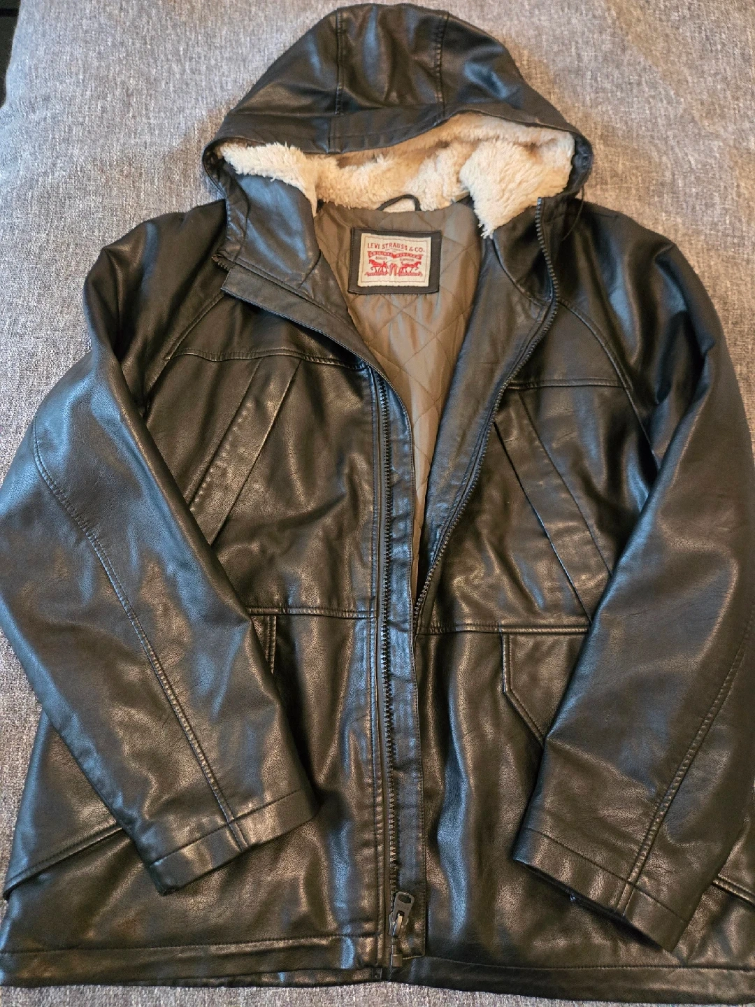81Levi Strauss & Co. black faux leather hooded jacket for sale! It features a cozy, fur-like lining in the hood and a quilted interior. Perfect for staying warm and stylish during those chilly days!