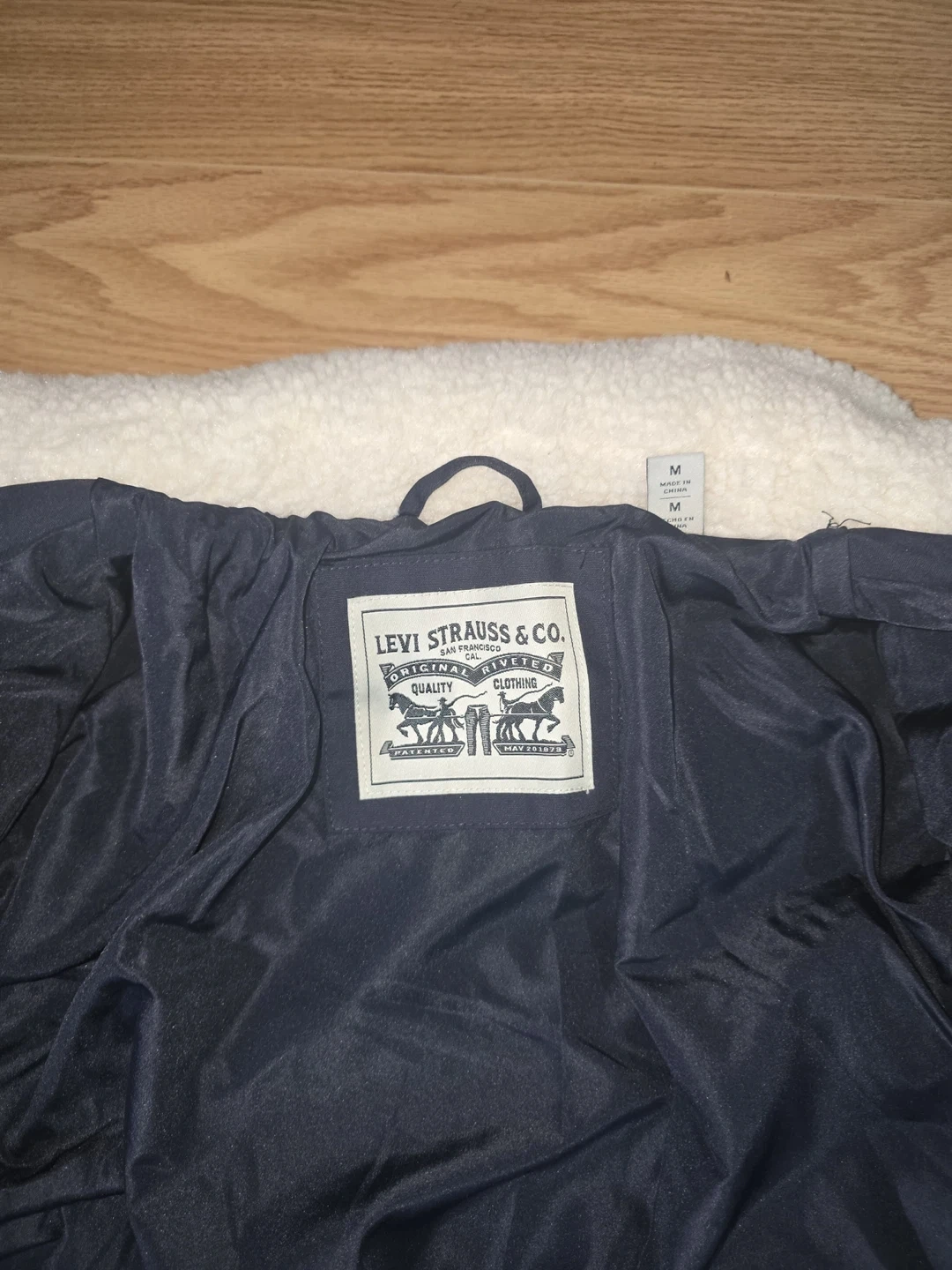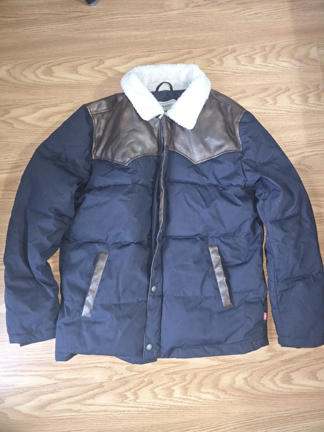27Levi Strauss & Co. puffer jacket in size medium. It features a unique design with a brown leather-like yoke and pocket accents, along with a cozy sherpa collar. Perfect for staying warm and stylish during the colder months!