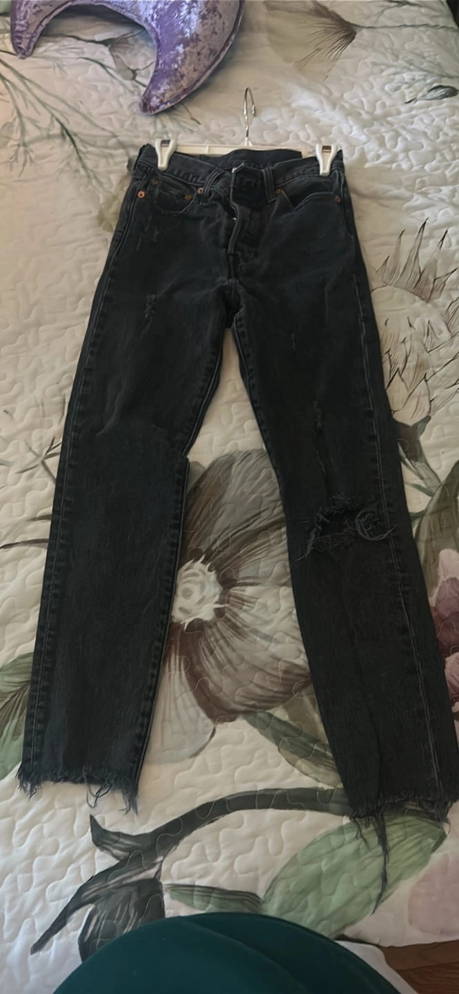 Selling a pair of Levi's jeans in black. They have a distressed look with some rips and raw hems. Great for a casual look! Size 25