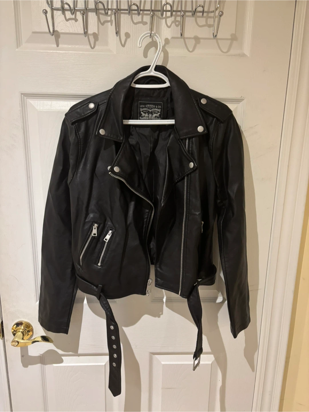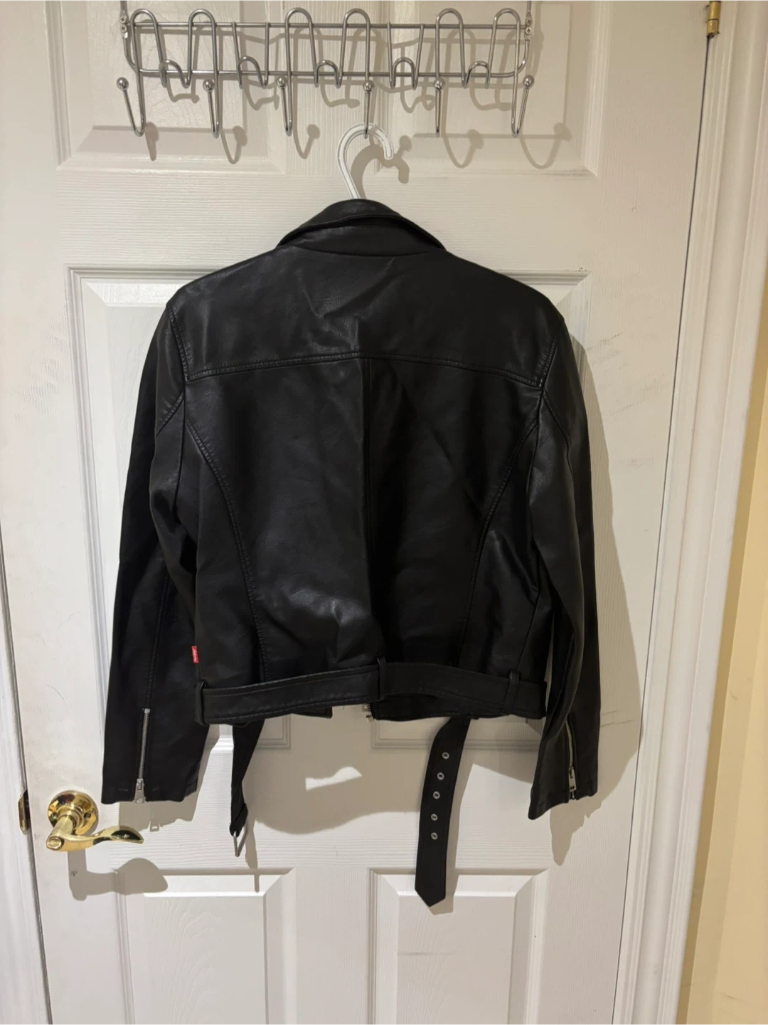 5Selling a Levi's black faux leather motorcycle jacket. It's in great condition and ready for a new home! The jacket features a classic design with silver hardware and a belted waist. Perfect for adding a bit of edge to any outfit