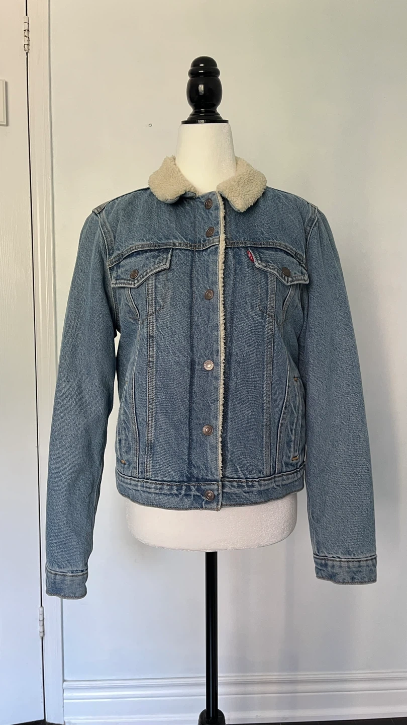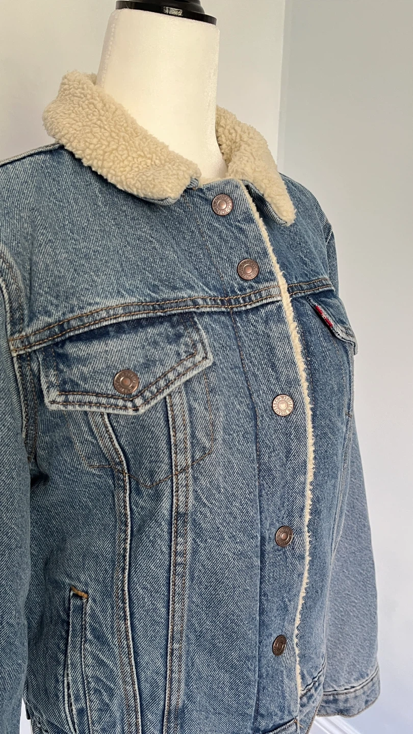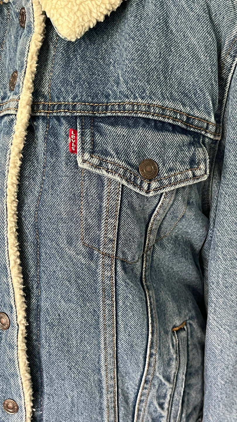 Cozy up in this Levi's denim trucker jacket with a sherpa collar and lining! It's a classic piece that's perfect for adding a bit of warmth and style to any outfit. The denim is a nice wash, and the sherpa adds a comfy touch.