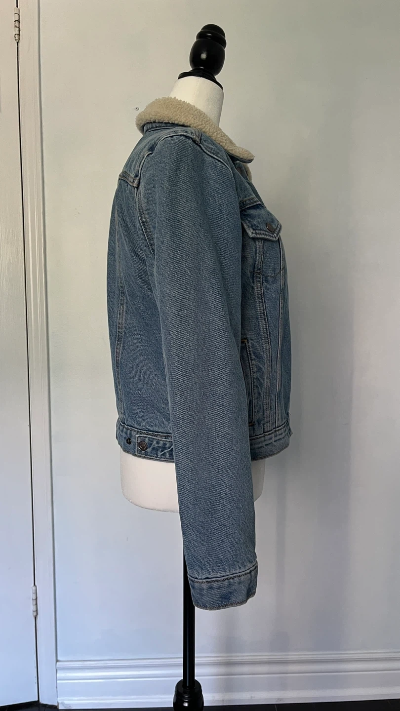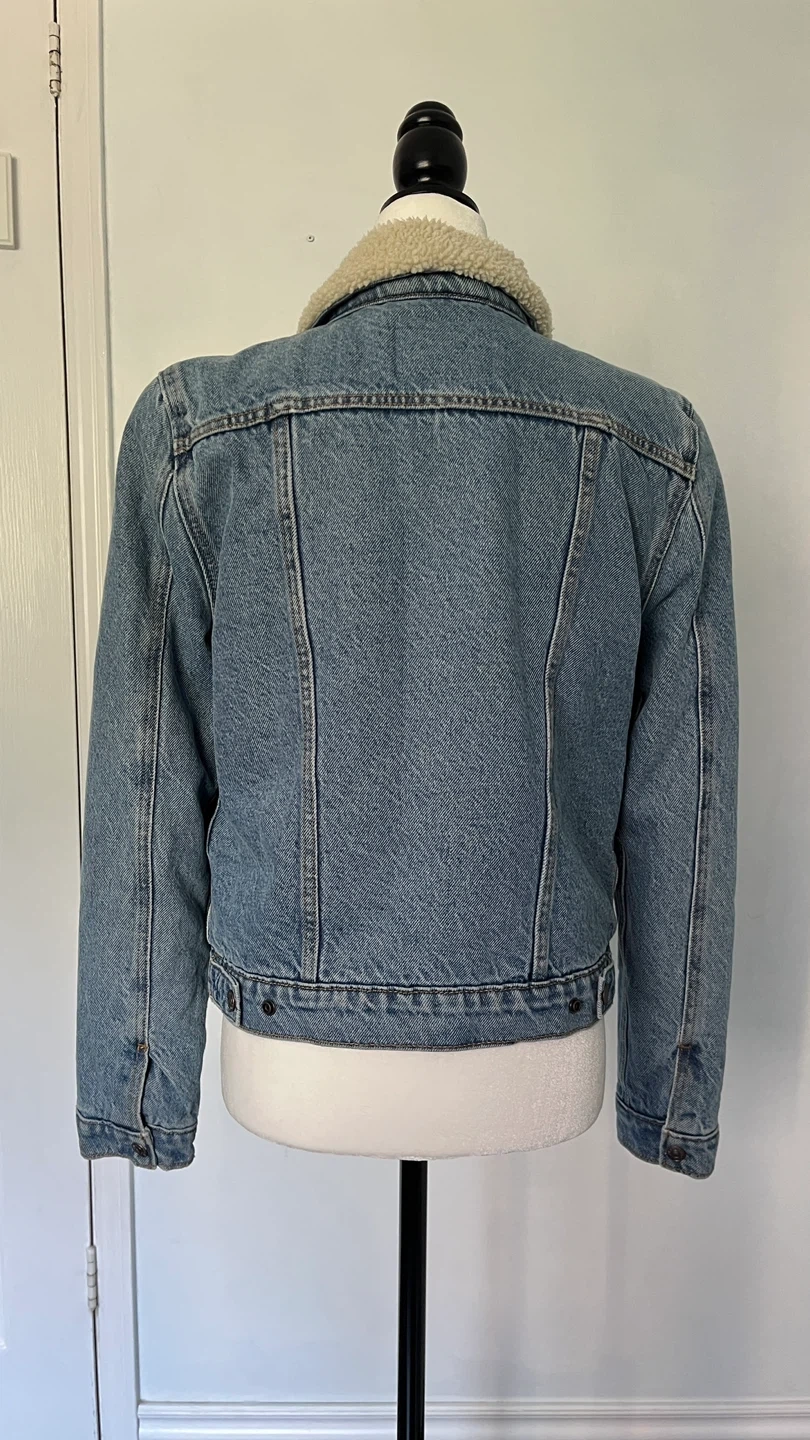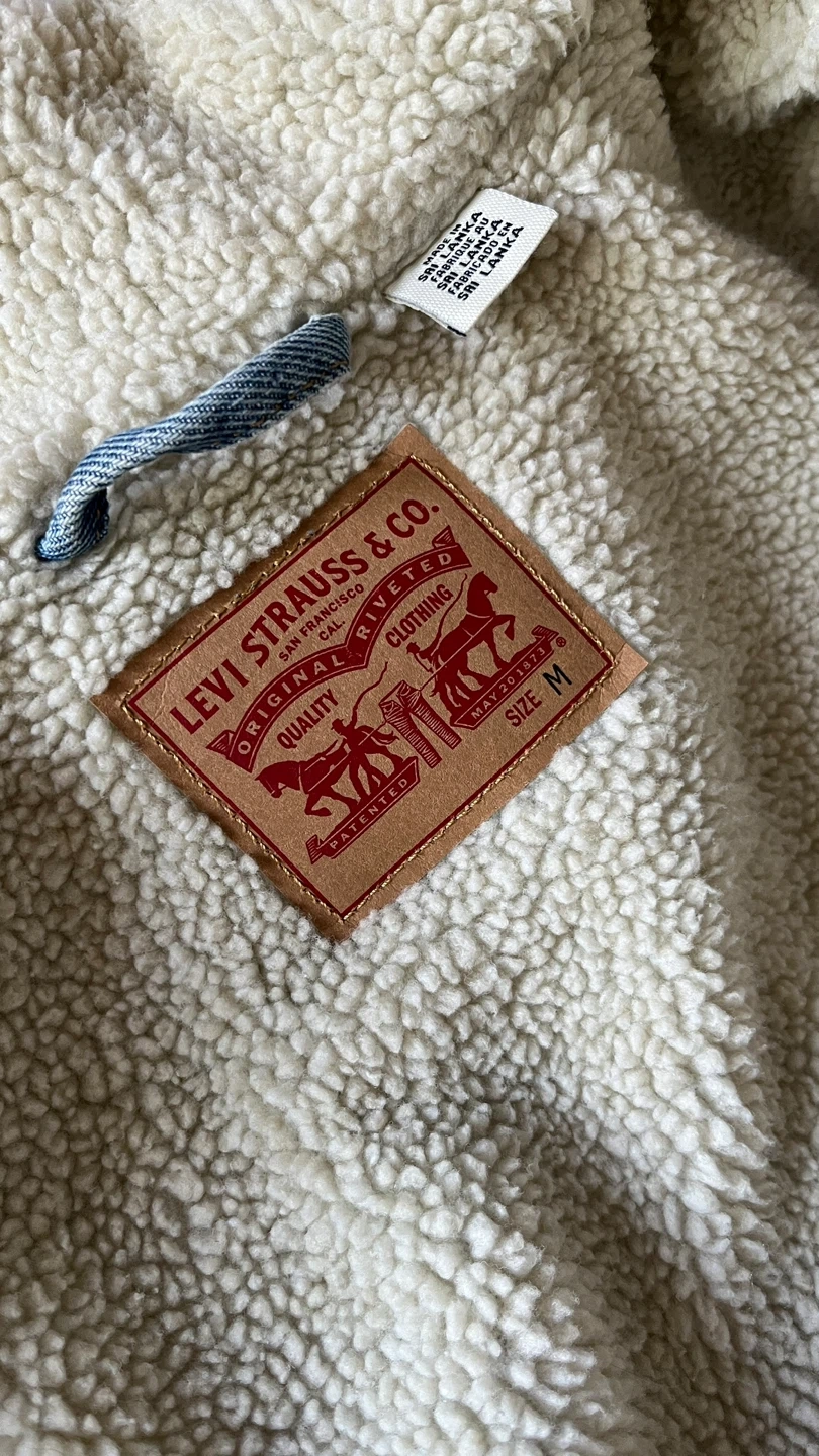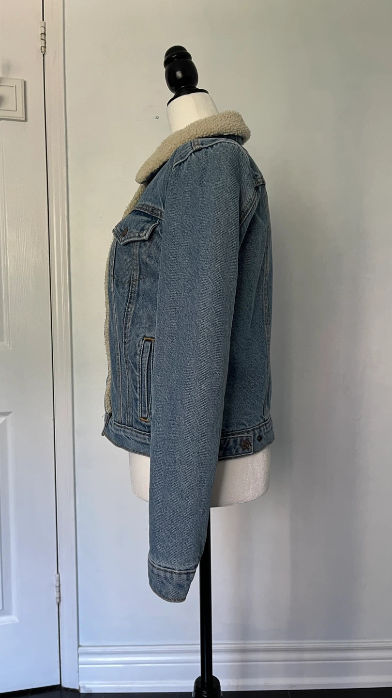 Cozy up in this Levi's denim trucker jacket with a sherpa collar and lining! It's a classic piece that's perfect for adding a bit of warmth and style to any outfit. The denim is a nice wash, and the sherpa adds a comfy touch.