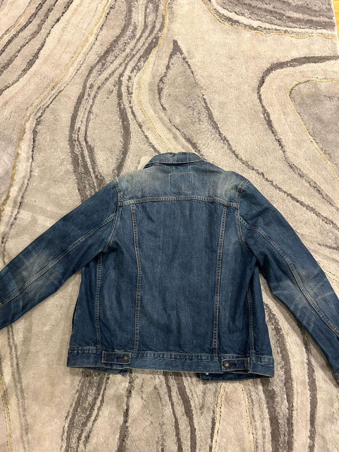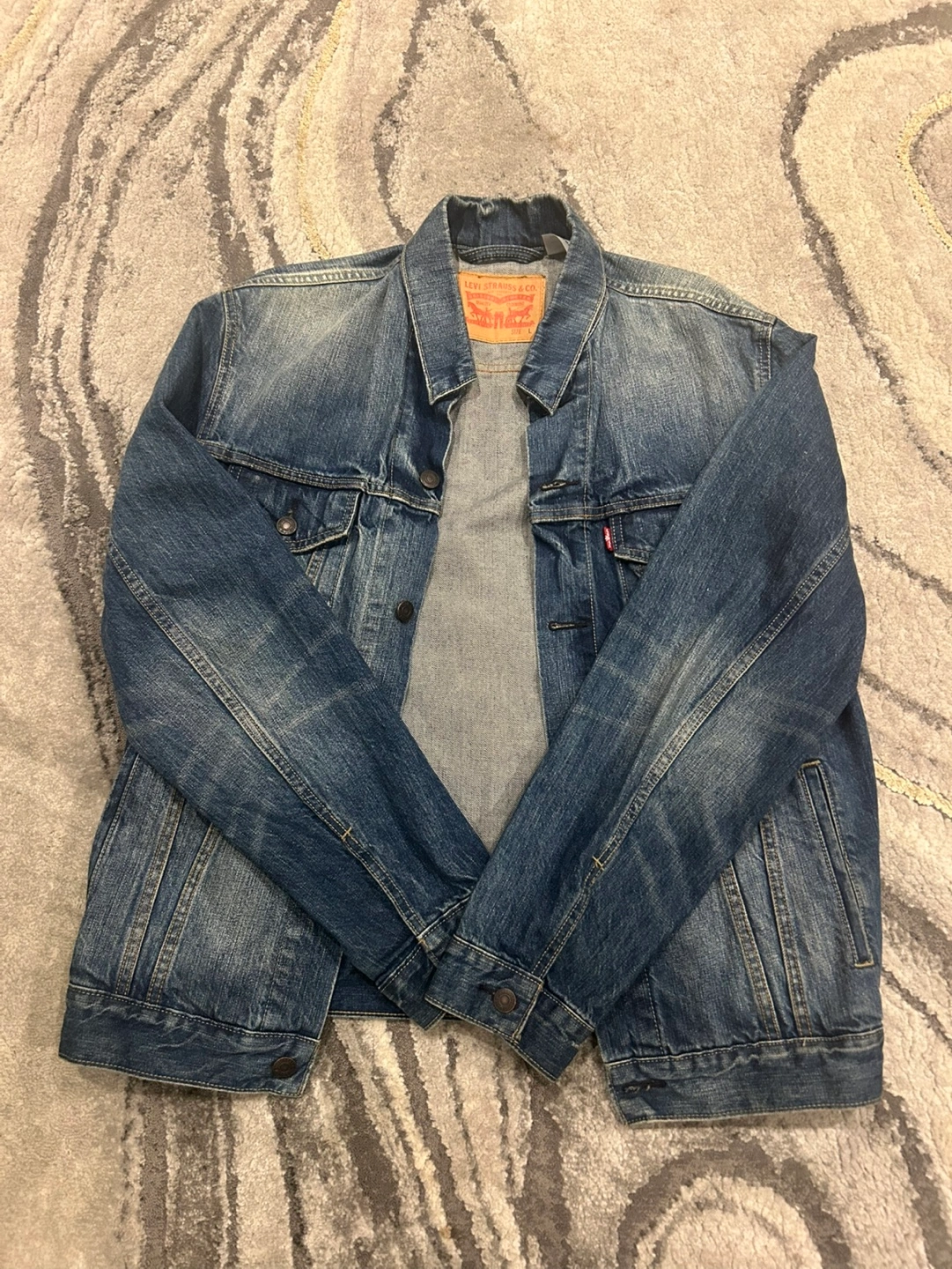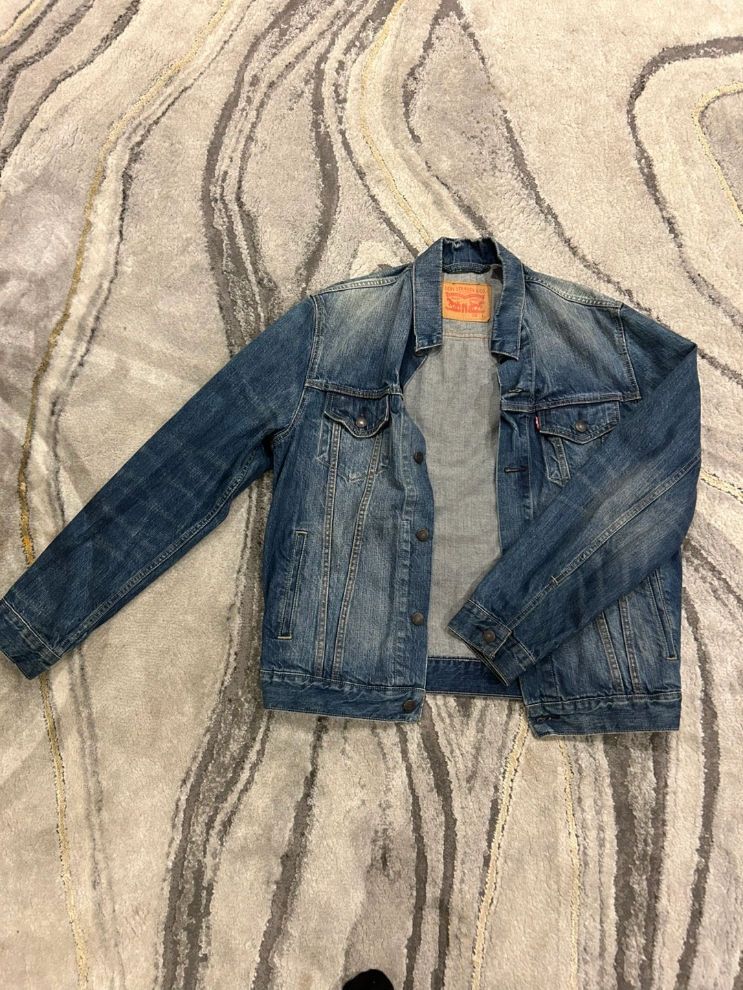 5Classic blue denim trucker jacket. Long sleeves. Button closure. Two chest pockets and two side pockets.