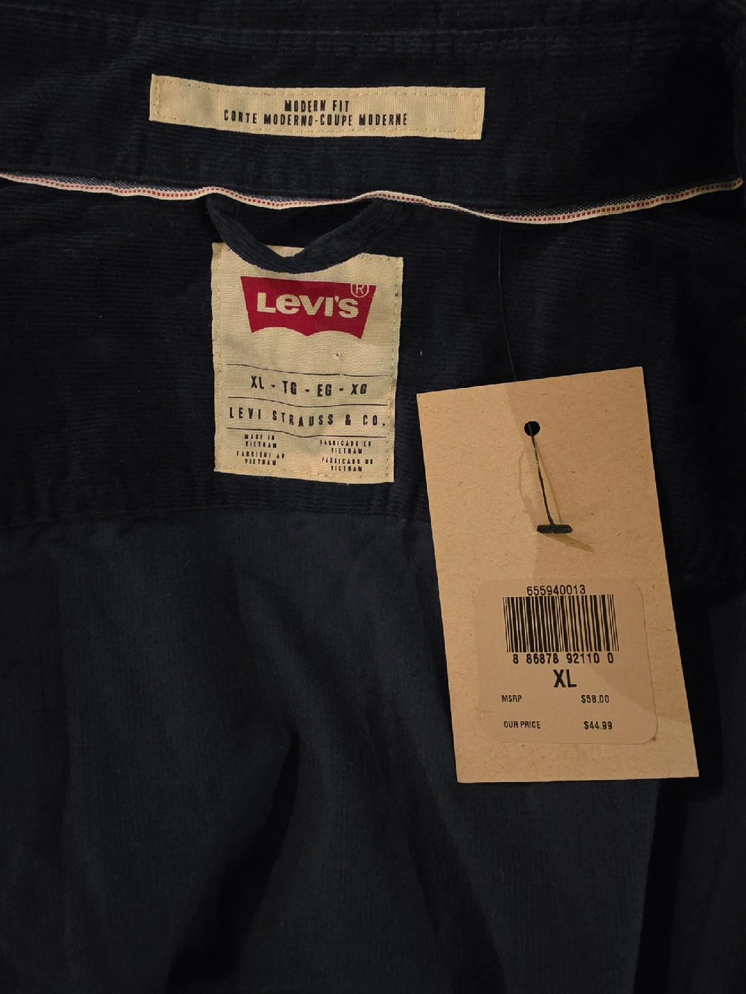 49Levi's corduroy shirt in excellent condition! It's a modern fit and size XL. The original price tag is still attached and shows a price of $59.00.