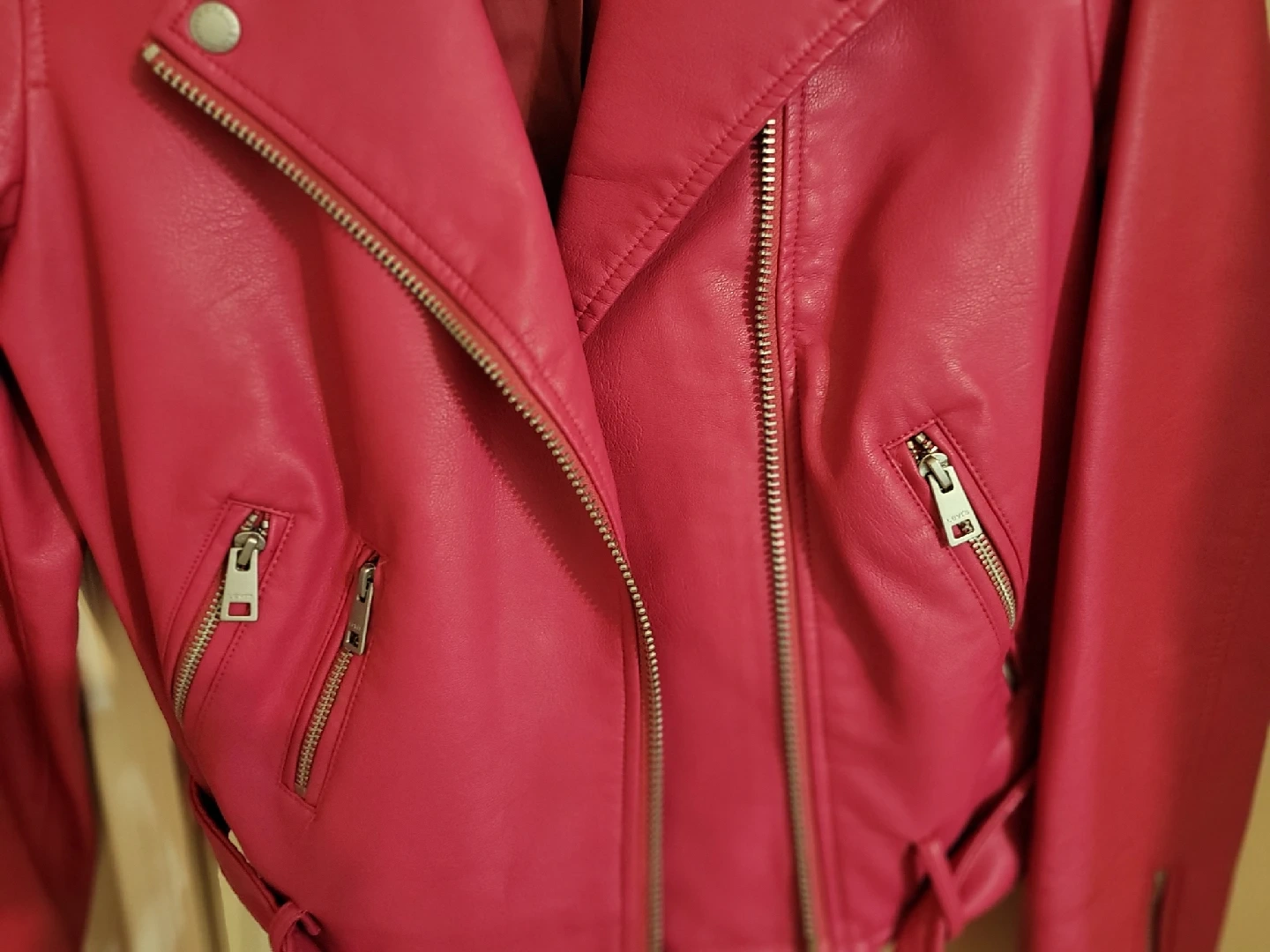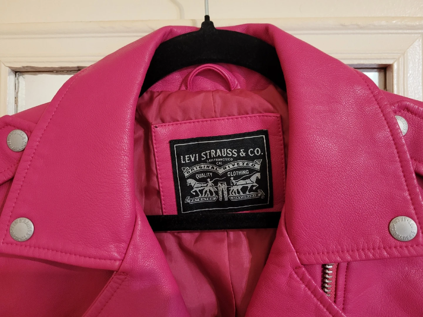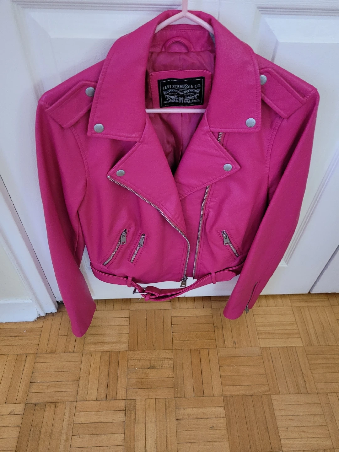 10Selling a Levi's pink faue leather jacket in size small but fits med.. It's in great condition and has a stylish, eye-catching colour! New never worn. Perfect for adding a pop of colour to your wardrobe. The jacket features a belted waist and a classic moto style. Fully lined inside. Only available for pickup.