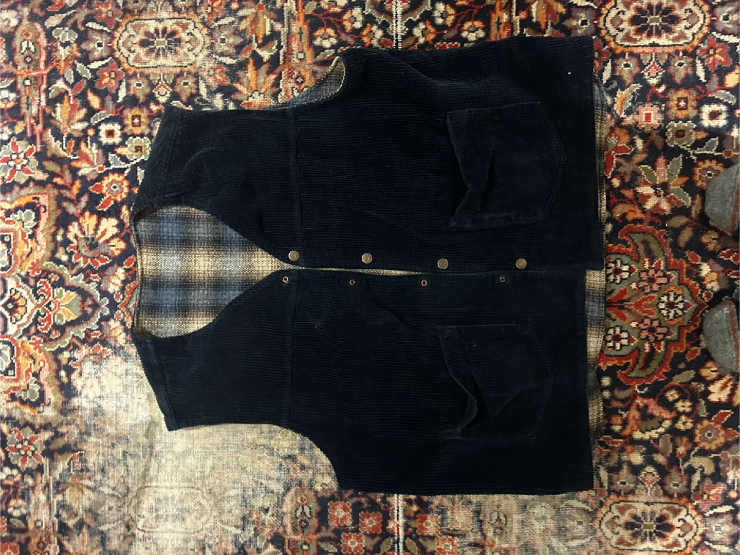 10This is a Levi's reversible vest. One side is a blue and brown plaid, and the other side is a dark blue corduroy. It has pockets on both sides!