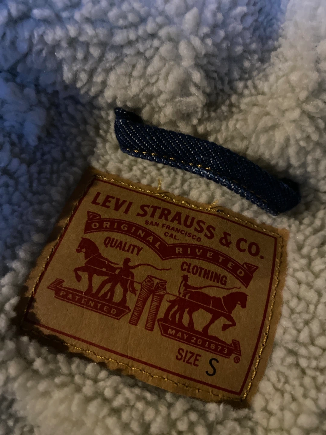 10Cozy up with this Levi's Sherpa Trucker Jacket! It's a size small and perfect for adding a bit of warmth and style to your outfit. The denim is in great shape and the sherpa lining is super soft. A classic piece that's ready for a new home!