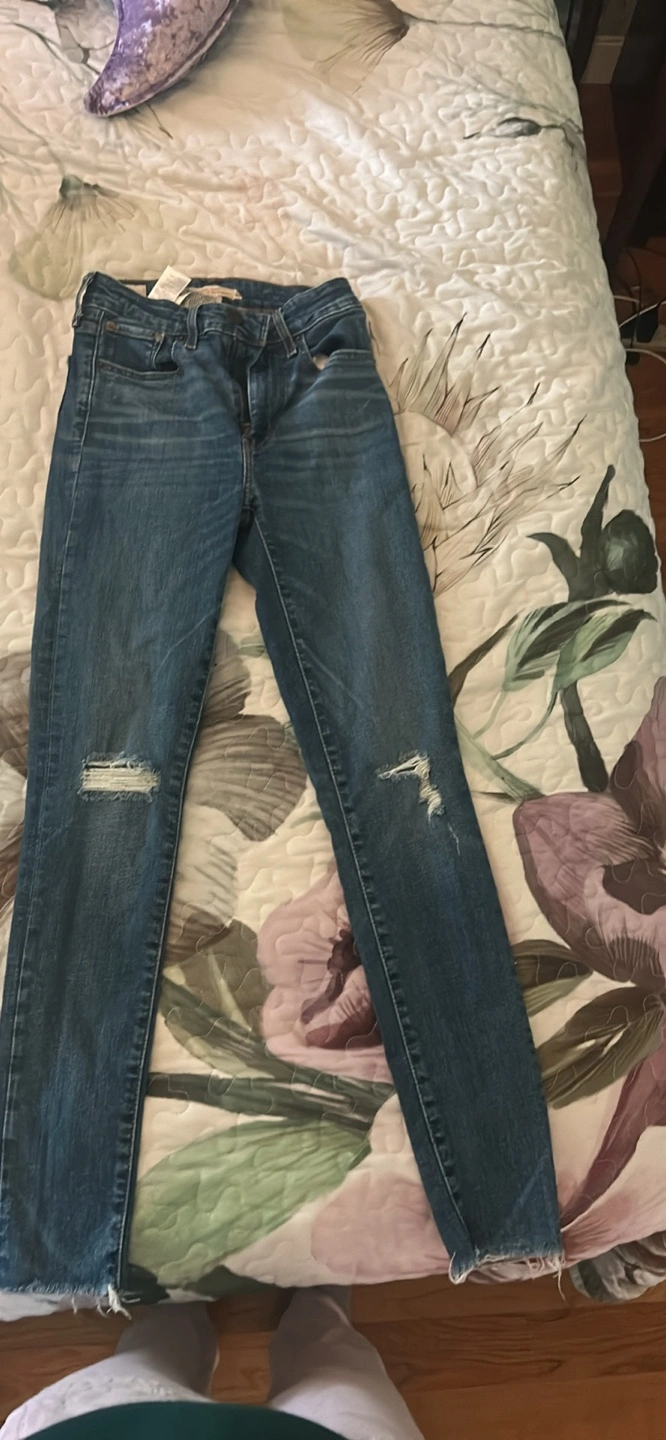 Levi's skinny jeans in a size 24. They are in good condition and have some distressing on the knees. Perfect for everyday wear!