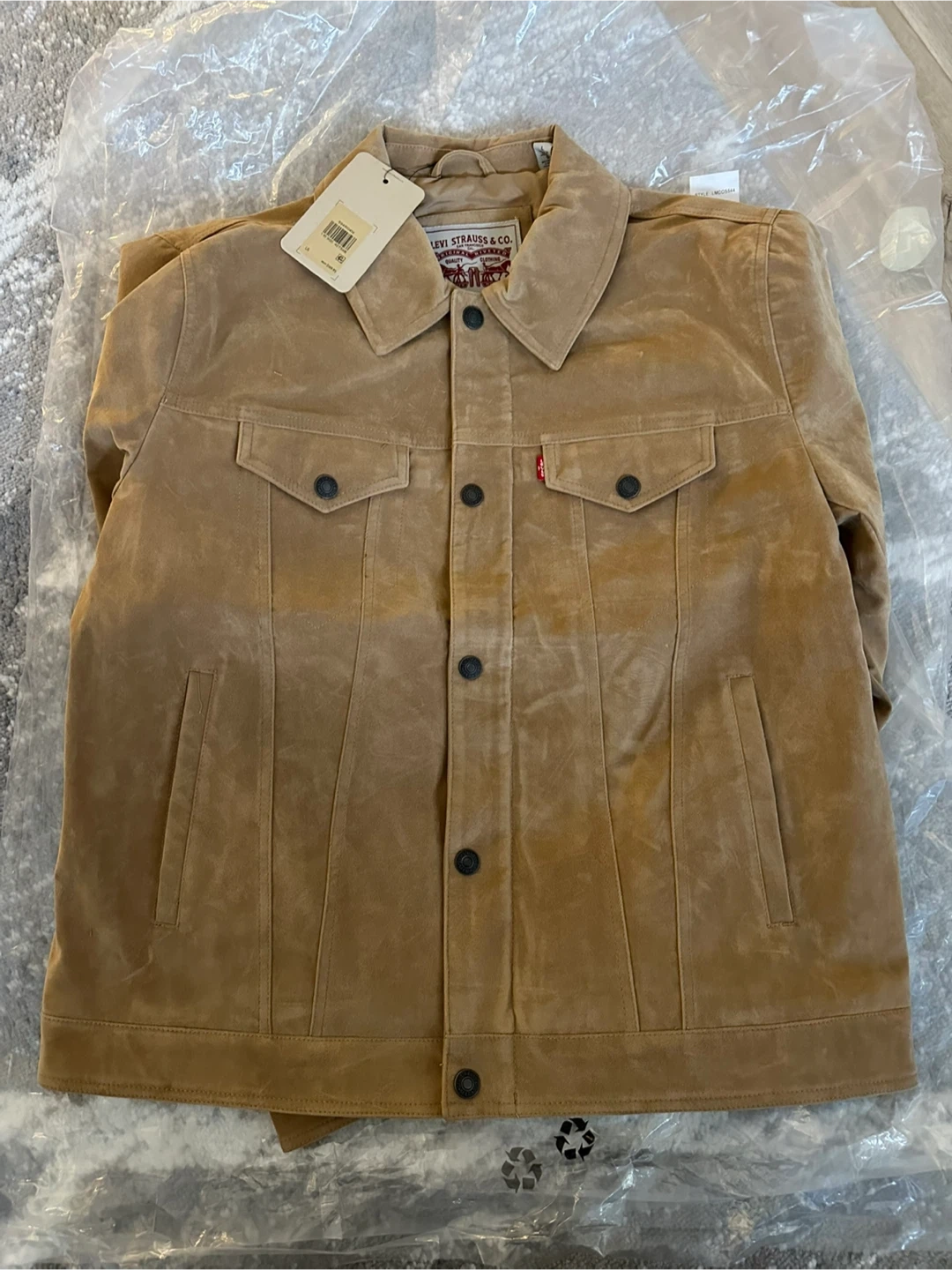 332I'm selling a brand new Levi Strauss & Co. suede trucker jacket! It's a size large and still in its original packaging. The tag shows an MSRP of $169.95, so you're getting a great deal. It's a stylish and classic piece to add to your wardrobe!