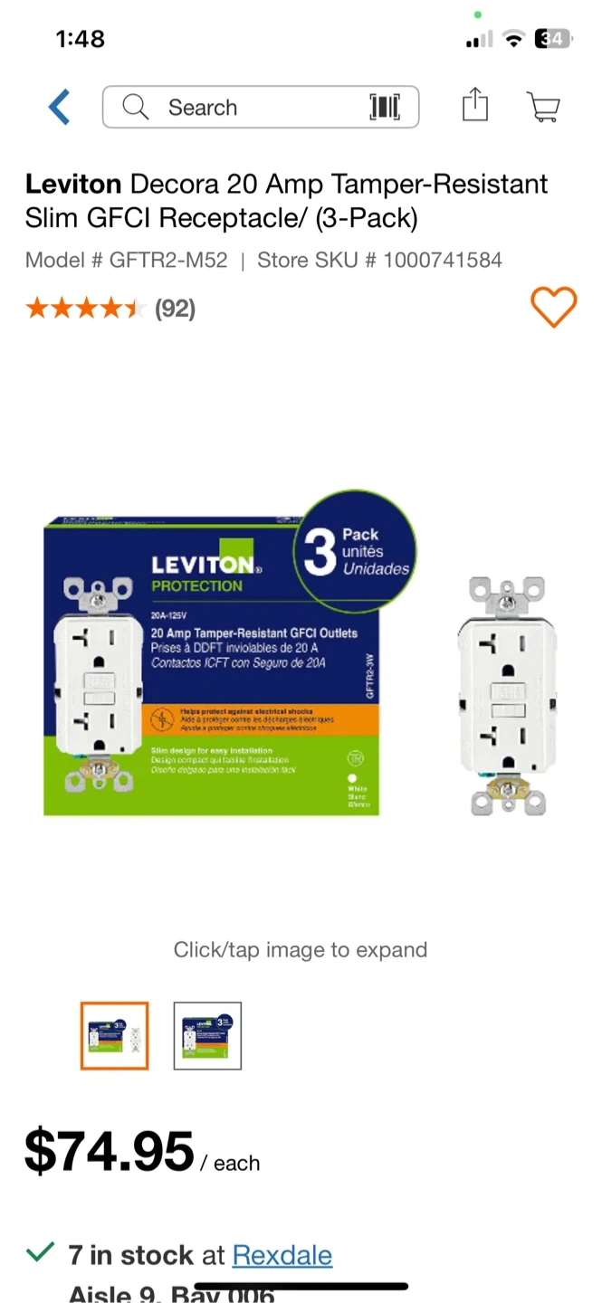 78Selling a Leviton Decora 20 Amp Tamper-Resistant Slim GFCI Receptacle, comes with 3 in a pack! Model # GFTR2-M52. These outlets provide 20A-125V protection and have a slim design for easy installation. Originally priced at $74.95.