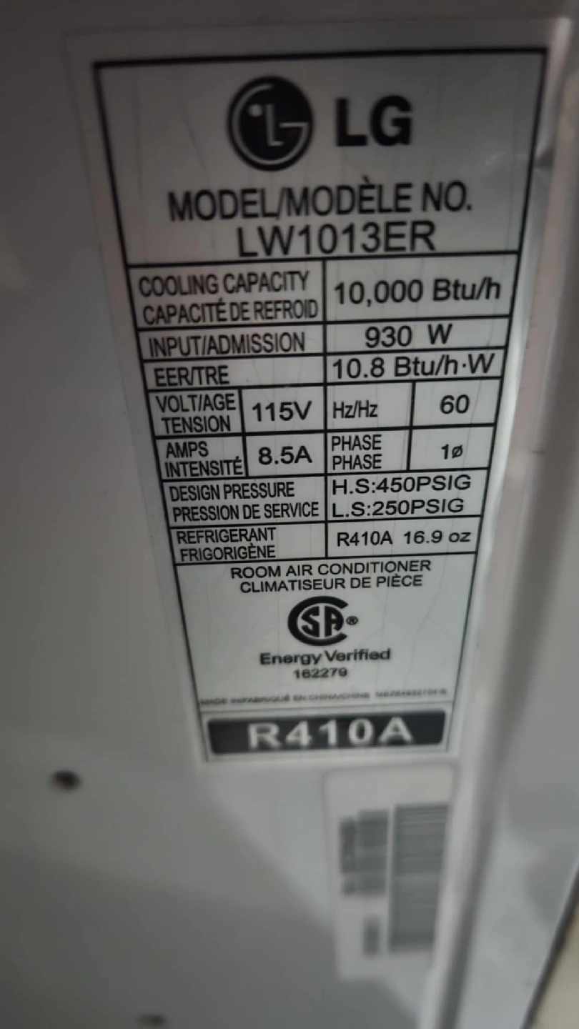 Selling an LG air conditioner, model LW1013ER. It has a cooling capacity of 10,000 BTU/h. It is a bit dusty, but is in like-new condition. It was used for only a few months, and then kept in storage. It is very effective at cooling a large room, or even a medium sized apartment. Perfect for keeping your space cool during the summer months!