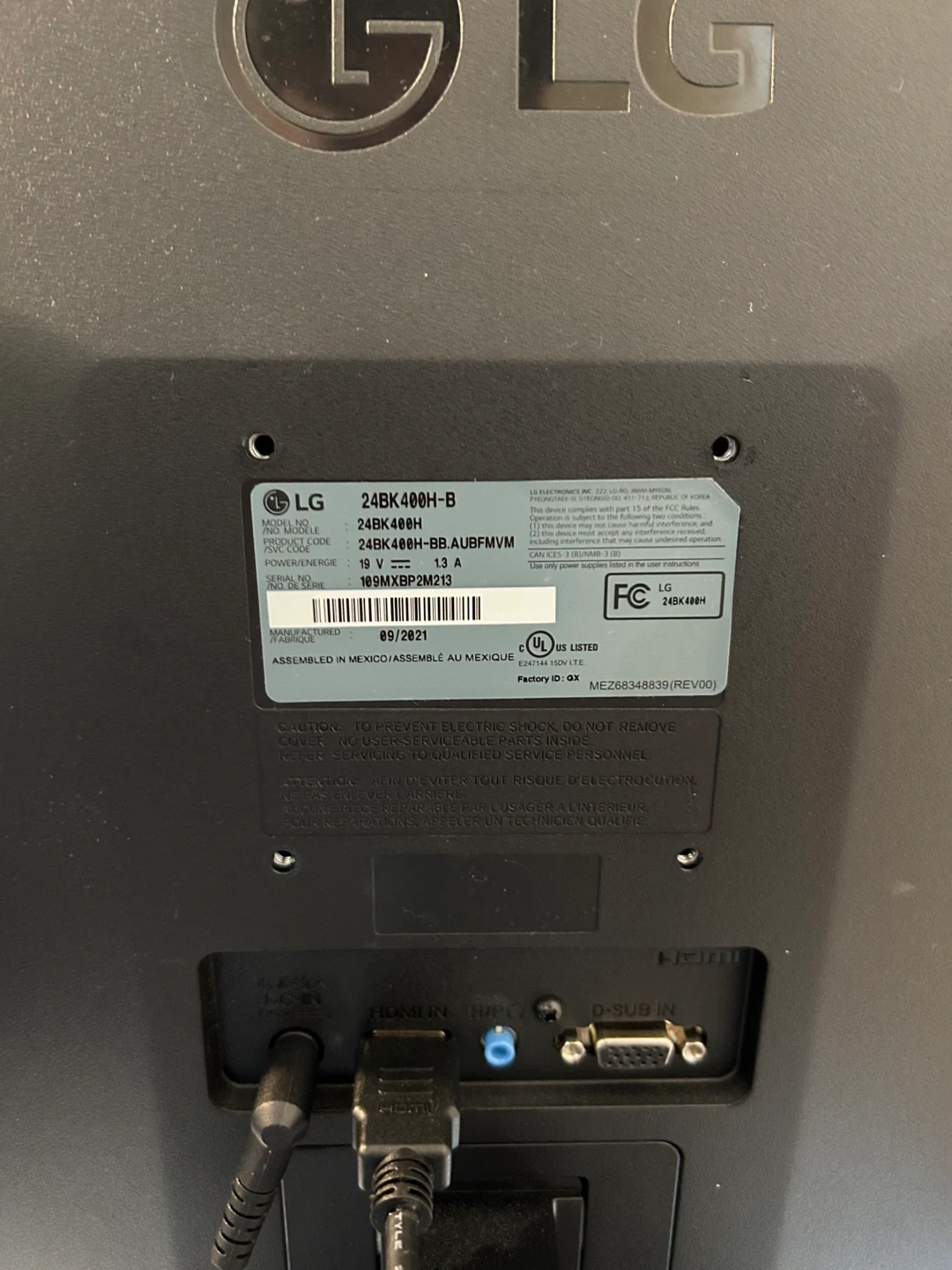Pretty much new No damage at all Selling an LG 24BK400H-B 24-inch monitor in great condition! It's perfect for home or office use. The model number is 24BK400H-BB.AUBFVM. It has a power rating of 19V and 2.1A.