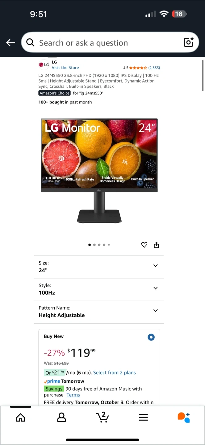 Price - Negotiable - Selling a barely used LG 24MS550 24-inch FHD (1920 x 1080) IPS Display monitor. It has a 100 Hz refresh rate and a height adjustable stand. It also features Eyecomfort and Dynamic Action Sync, as well as built-in speakers. The monitor is black and has HDMI ports for connectivity. - Great for students, gamers, or streamers for main display or secondary display. It’s retailing at $120 CAD right now.