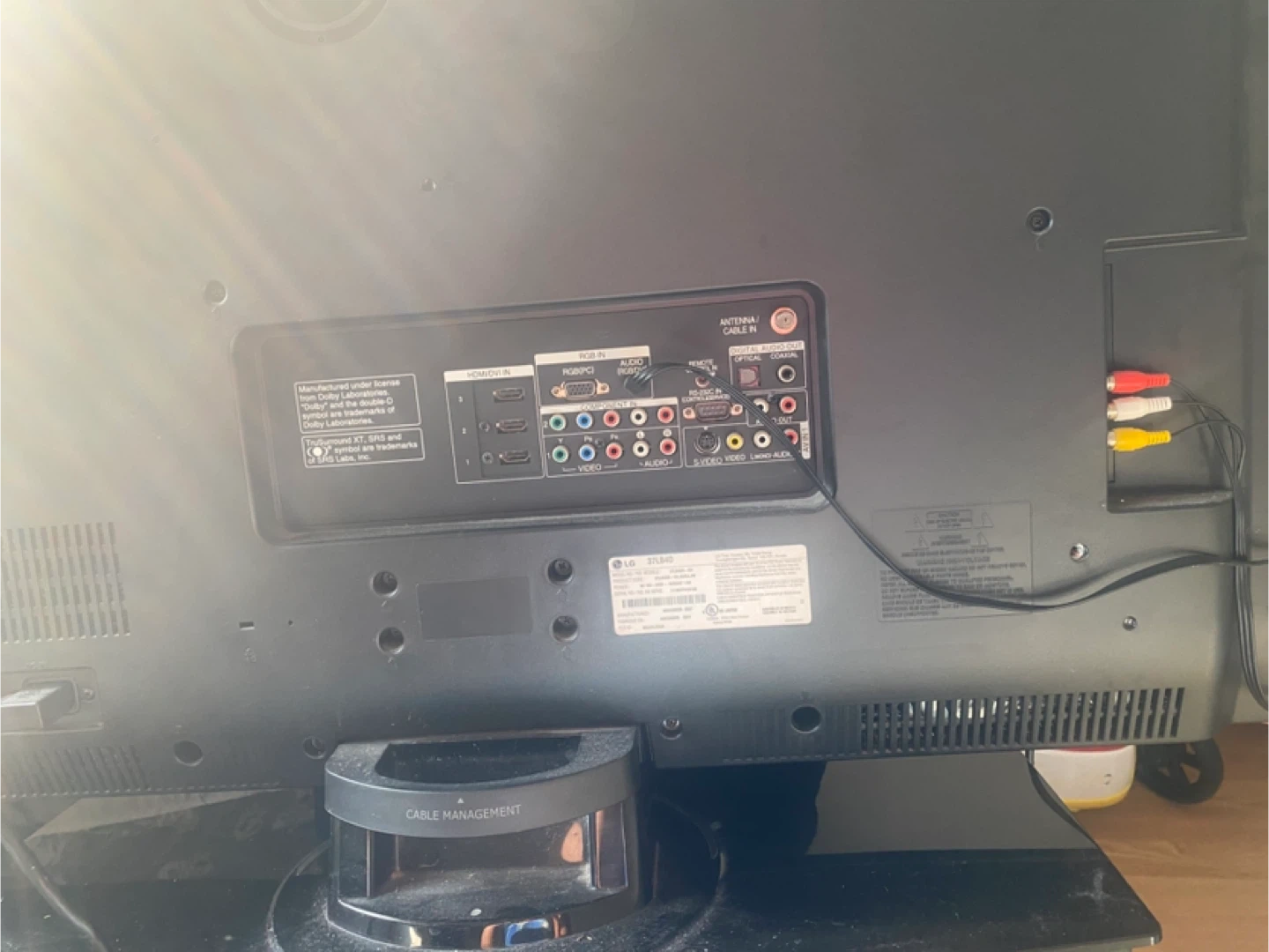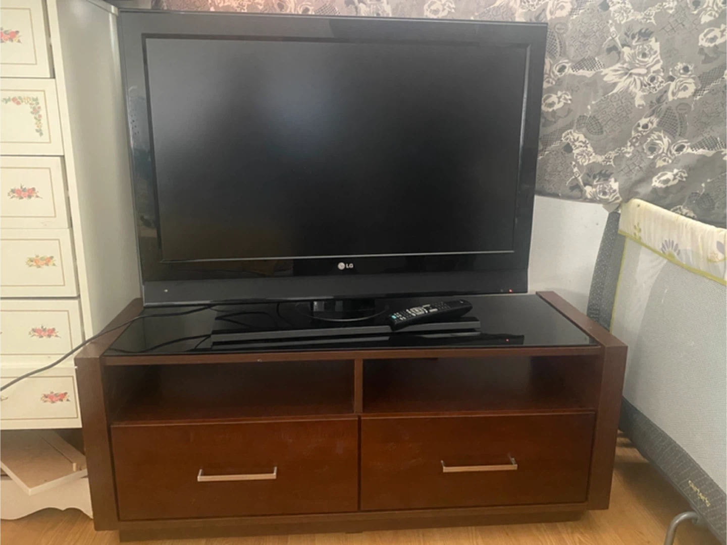 Selling an LG 37LG30 LCD TV with a TV stand. The TV has various ports in the back for connectivity. The stand is a dark wood colour with a black glass top and two drawers for storage. The TV is in good working condition .