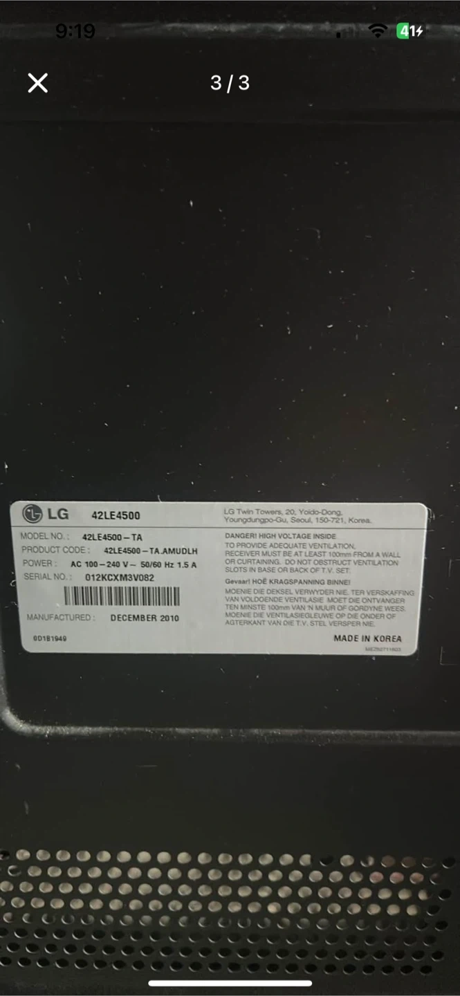 Selling an LG 42LE4500 TV, it's 42 inches. Manufactured in December 2010. Feel free to ask any questions!