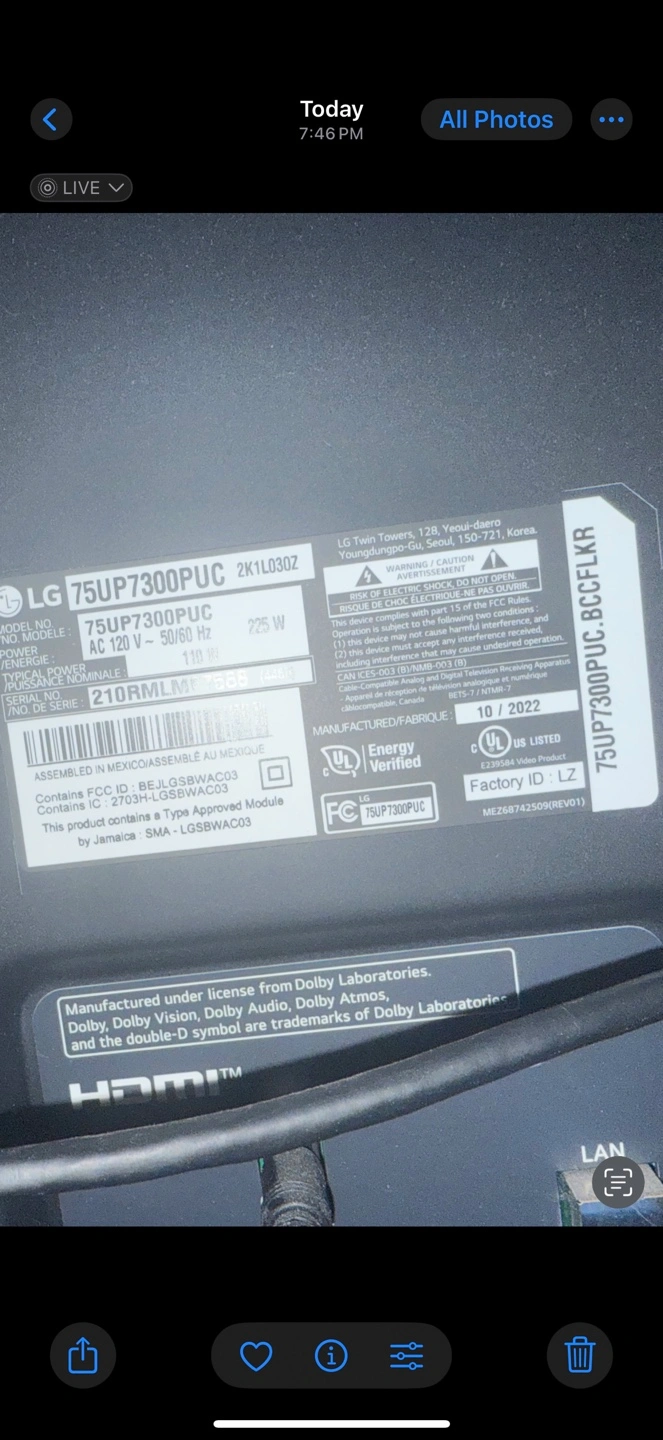 65Large screen TV. Excellent picture quality. Smart TV features. Dolby Audio and Atmos. LG 75” smart tv Quad Core Processor 4K TruMotion Native 60Hz Real 4K Display Unlimited Entertainment (Netflix, Apple TV+, Disney+, etc.) LG Channels $700
