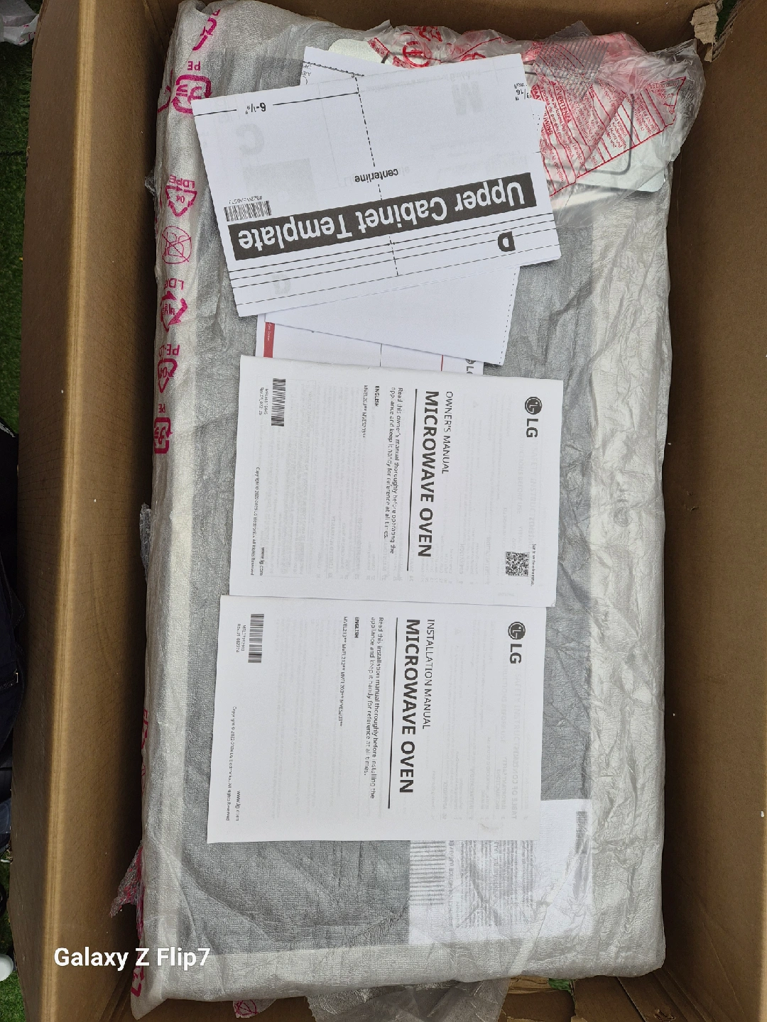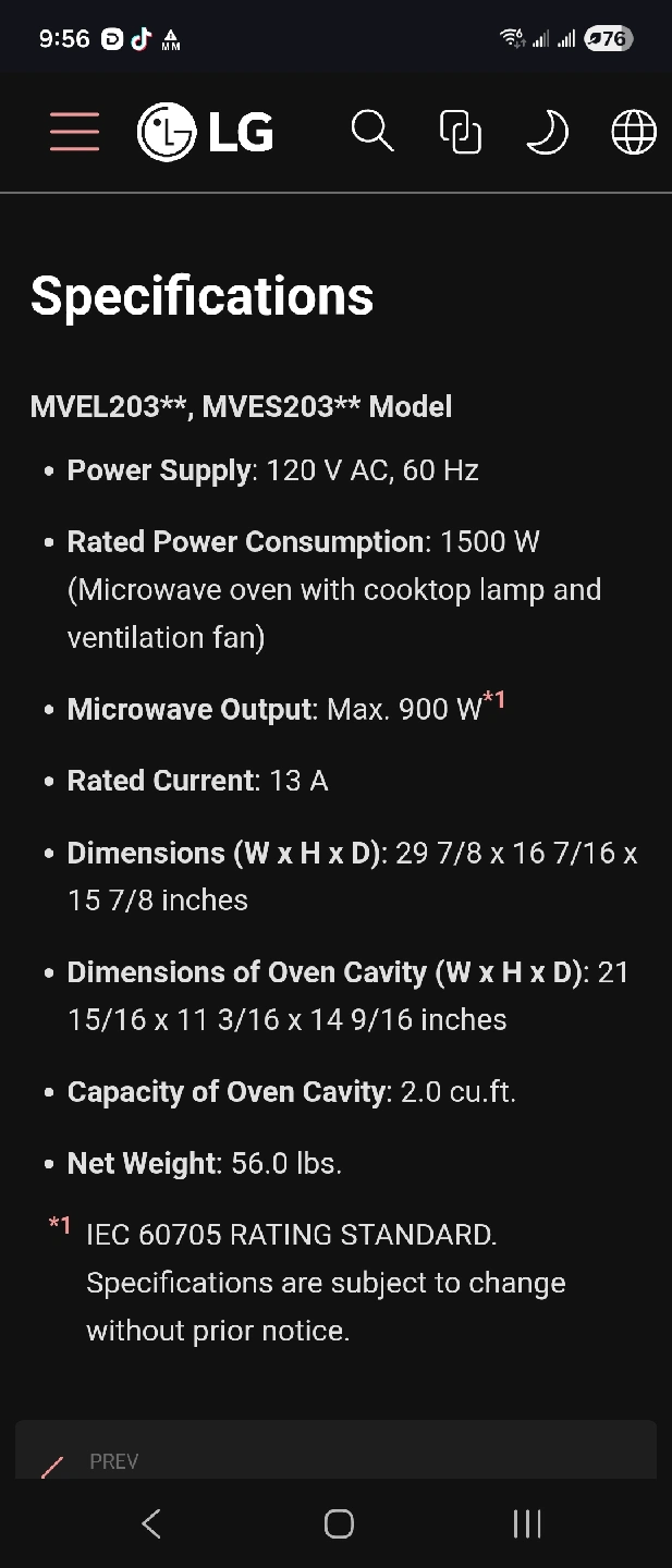 76Selling an LG MVES203 over-the-range microwave oven. It's in like-new condition and comes with all the original components and accessories, including the upper cabinet template and owner's manual. Key specs: - Power Supply: 120 V AC, 60 Hz - Rated Power Consumption: 1500 W - Microwave Output: Max. 900 W - Dimensions (W x H x D): 29 7/8 x 16 7/16 x 15 7/8 inches - Oven Cavity Capacity: 2.0 cu.ft - Net Weight: 56.0 lbs It's ready to install and use right away!