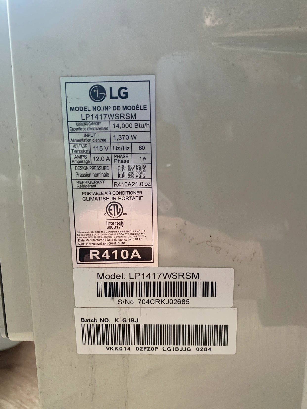 LG portable air conditioner, has a digital display. Has some wear and tear but overall works great. Pick up only by Eaton Centre.