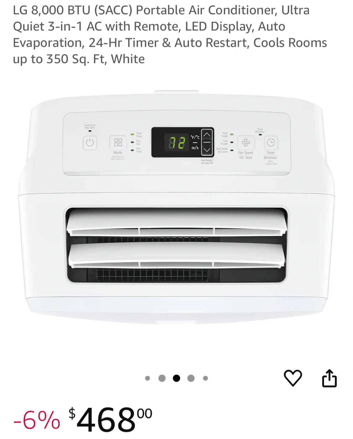 102 LG Portable Air Conditioners – 8,000 BTU, Black/Grey, 3-in-1 Cooling Unit Each 300$ Both 500$ Used LG portable AC in good shape — works great and cools a room fast! It’s an 8,000 BTU 3-in-1 unit (cool, fan, and dehumidifier modes). Comes with the exhaust hose and window vent. A few scratches on the outside but nothing major — just normal wear. Perfect for a bedroom or small apartment. Plug in and it’s ready to go!