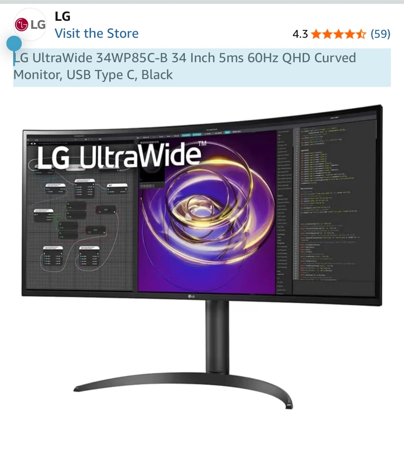 5Selling an LG UltraWide 34WP85C-B 34-inch curved monitor. It's a QHD (2560 x 1440) display with a 5ms response time and a 60Hz refresh rate. The monitor also has USB Type-C connectivity. Great for multitasking!