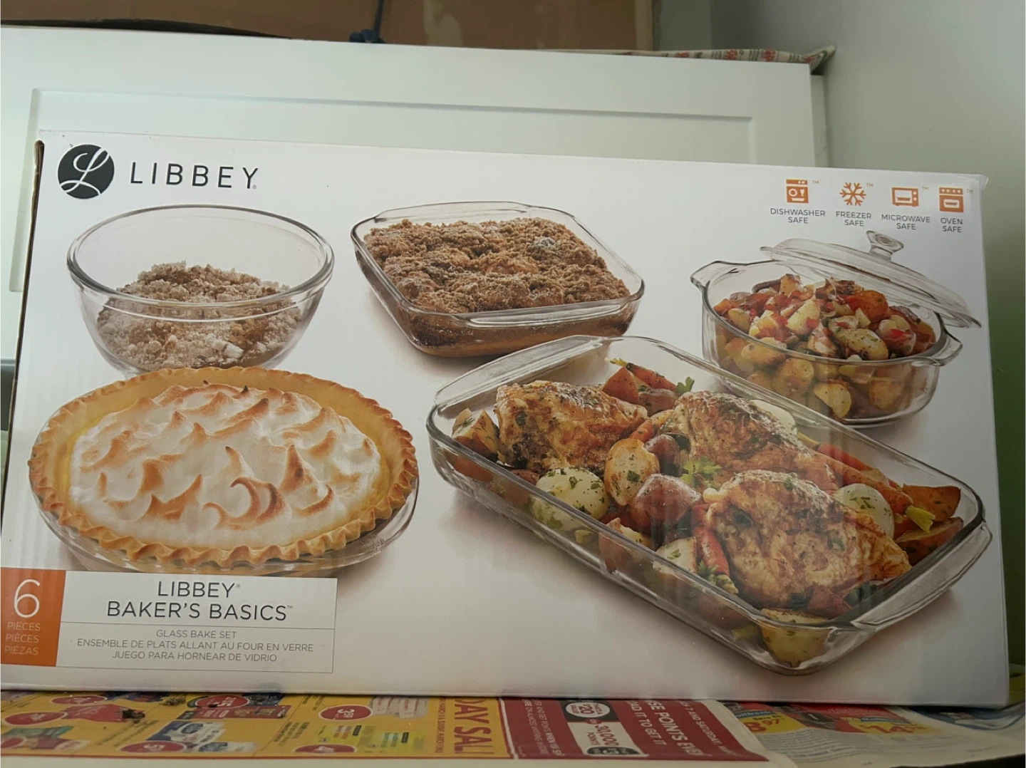 Selling a Libbey Baker's Basics 6-piece glass bake set! This set includes various glass dishes suitable for baking, and they are dishwasher, freezer, microwave, and oven safe. Perfect for all your baking needs! Brand new Not opened yet Moving sale