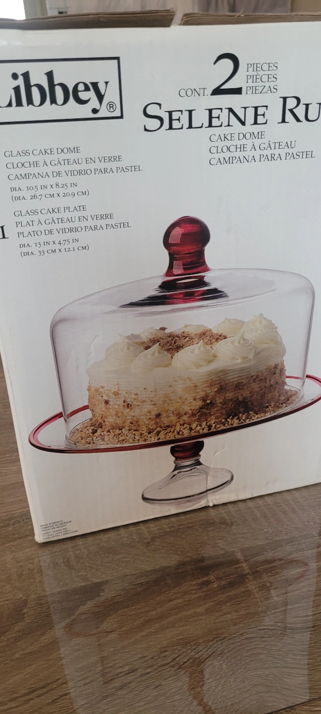 New in box. Two-piece glass cake dome. Red accents. Elegant design. Perfect for serving cakes and desserts.