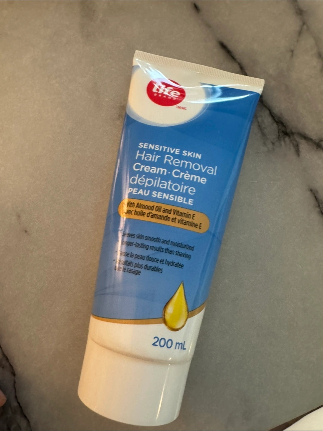 231I'm selling a tube of Life Brand Sensitive Skin Hair Removal Cream. It's a 200mL tube designed for sensitive skin. It contains almond oil and vitamin E to leave skin smooth and moisturized, offering longer-lasting results than shaving. Only used once!