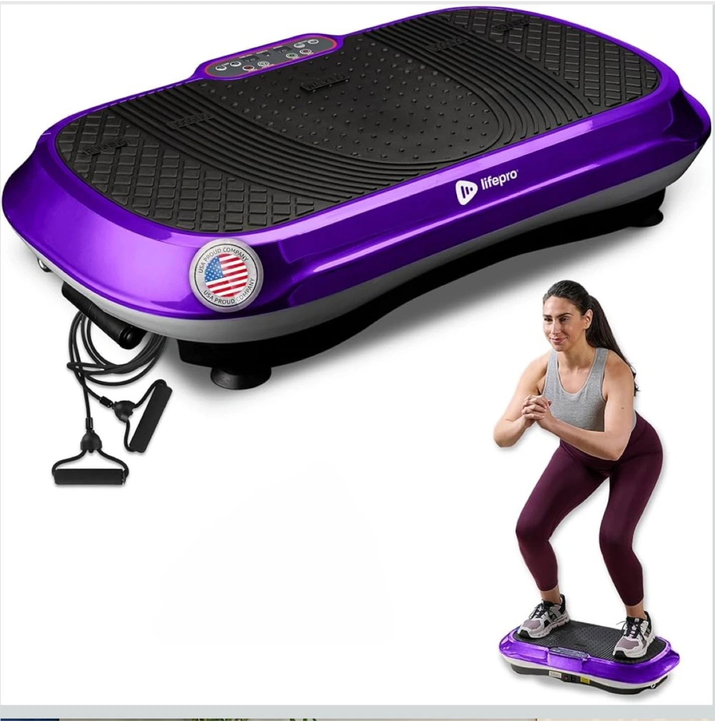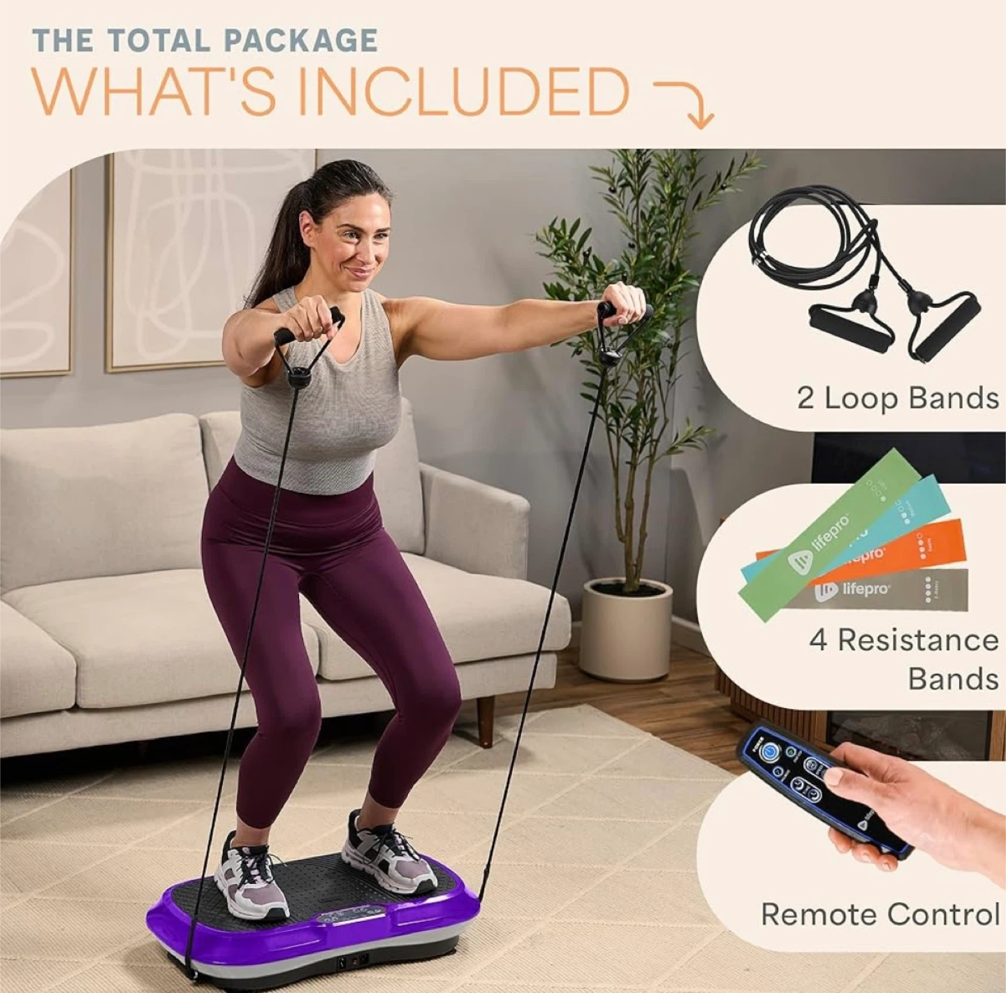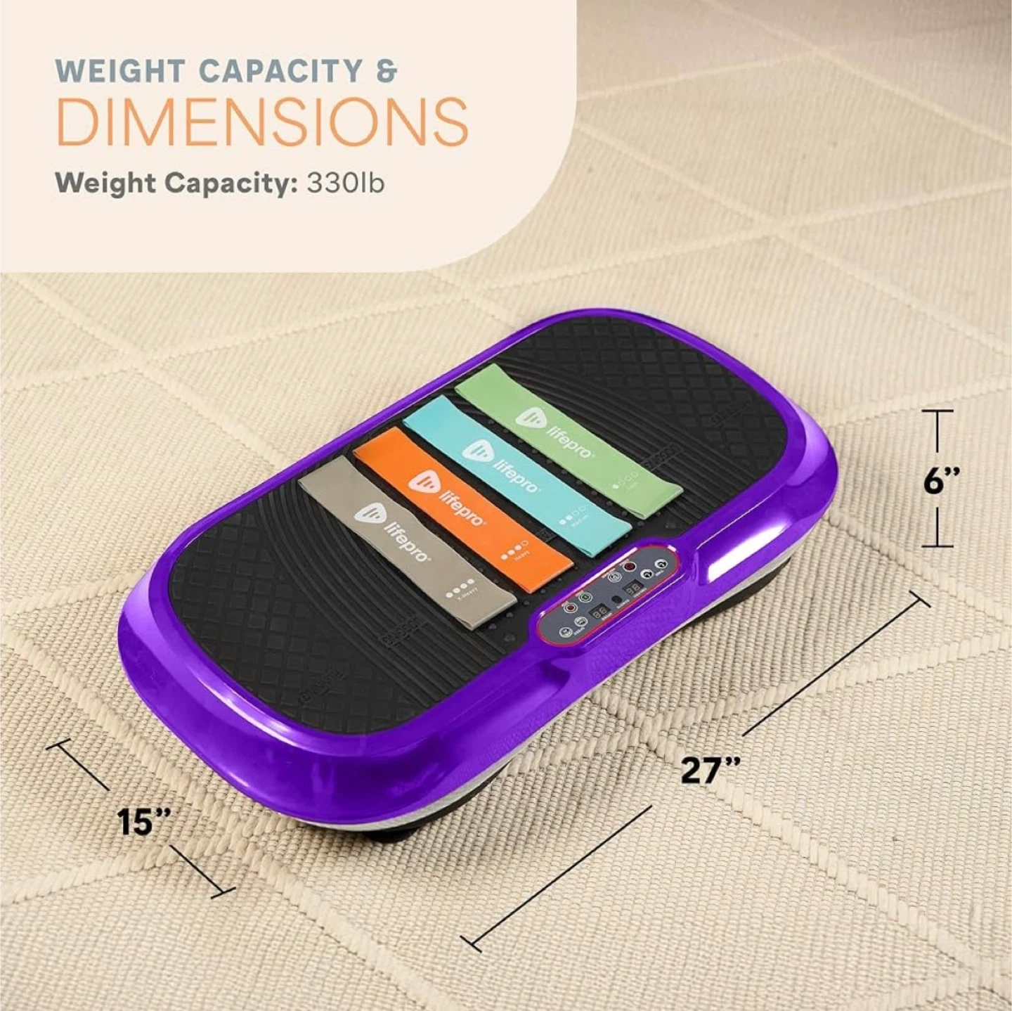 18Get ready to shake things up with this LifePro vibration plate! It's a fun way to add a little extra to your workout routine. It comes with: - 2 loop bands - 4 resistance bands - Remote control Dimensions: 27" x 15" x 6" Weight capacity: 330lb