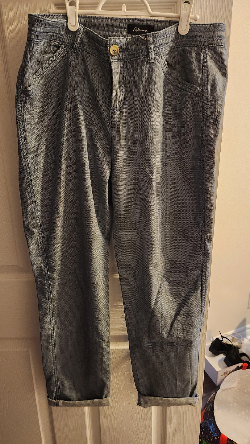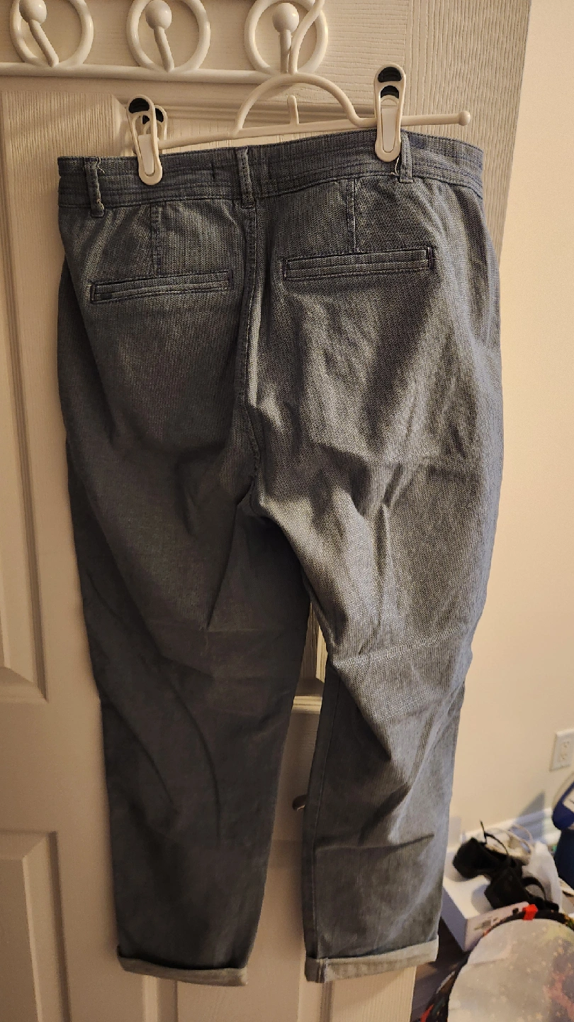 192stretchy light blue ankle length pants. they have a cuff. size 8 petite. I am 5"5 and they fit to the ankle