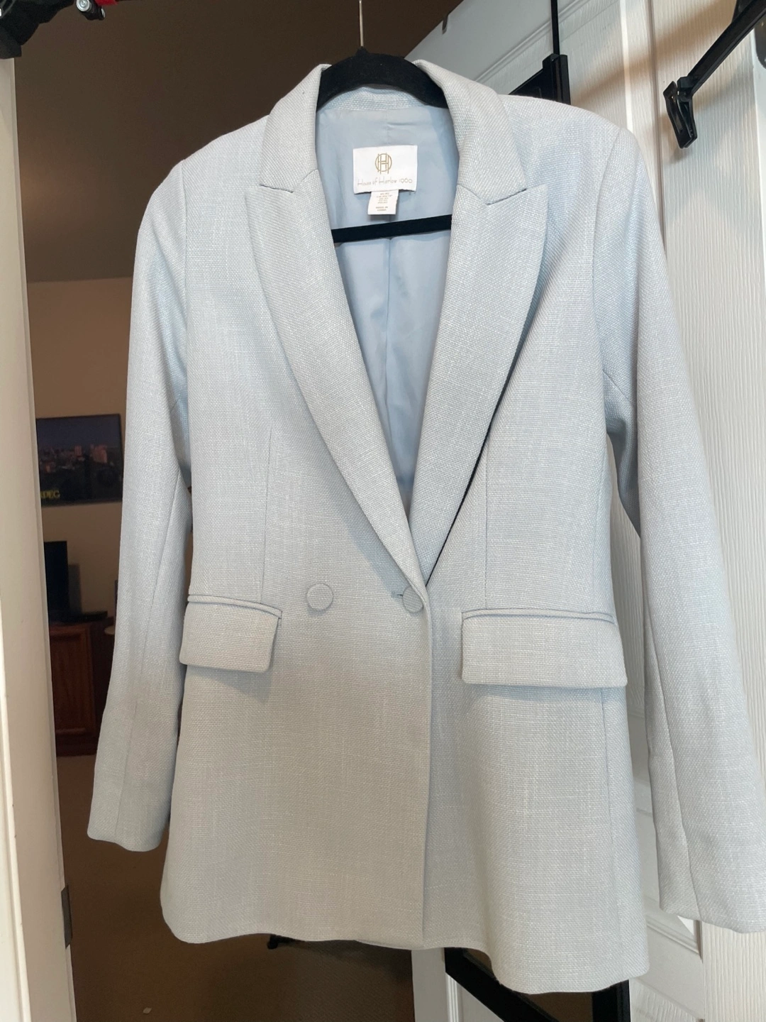 Description: Beautiful light blue blazer from House of Harlow 1960. • Tailored fit with structured shoulders • Double-button closure, flap pockets, fully lined • Chic and versatile—perfect for office, dinner, or casual layering • Excellent condition, worn only once, no flaws