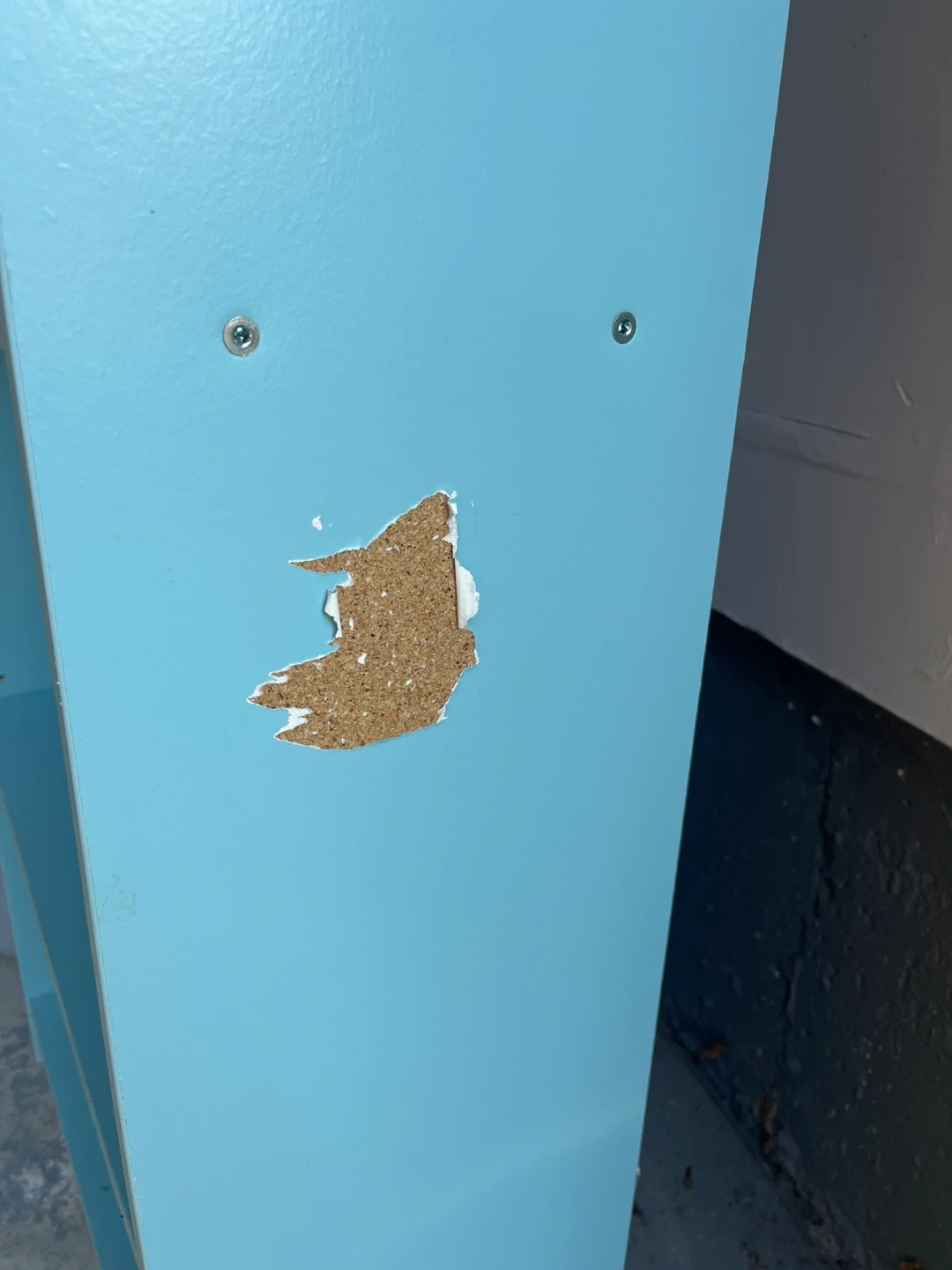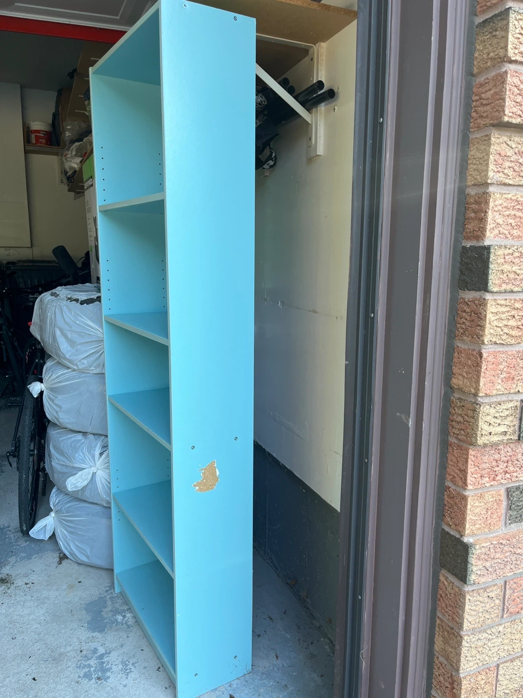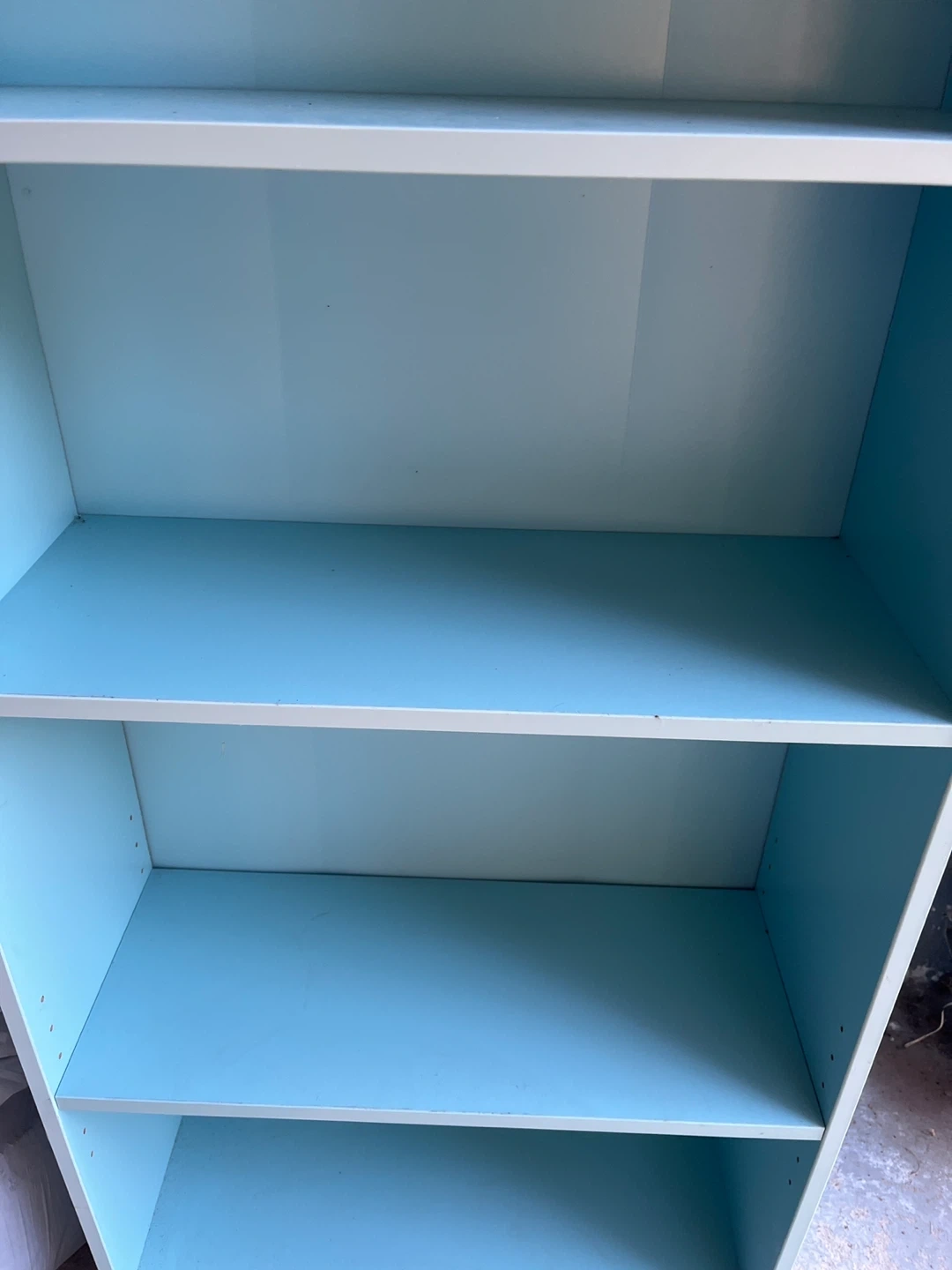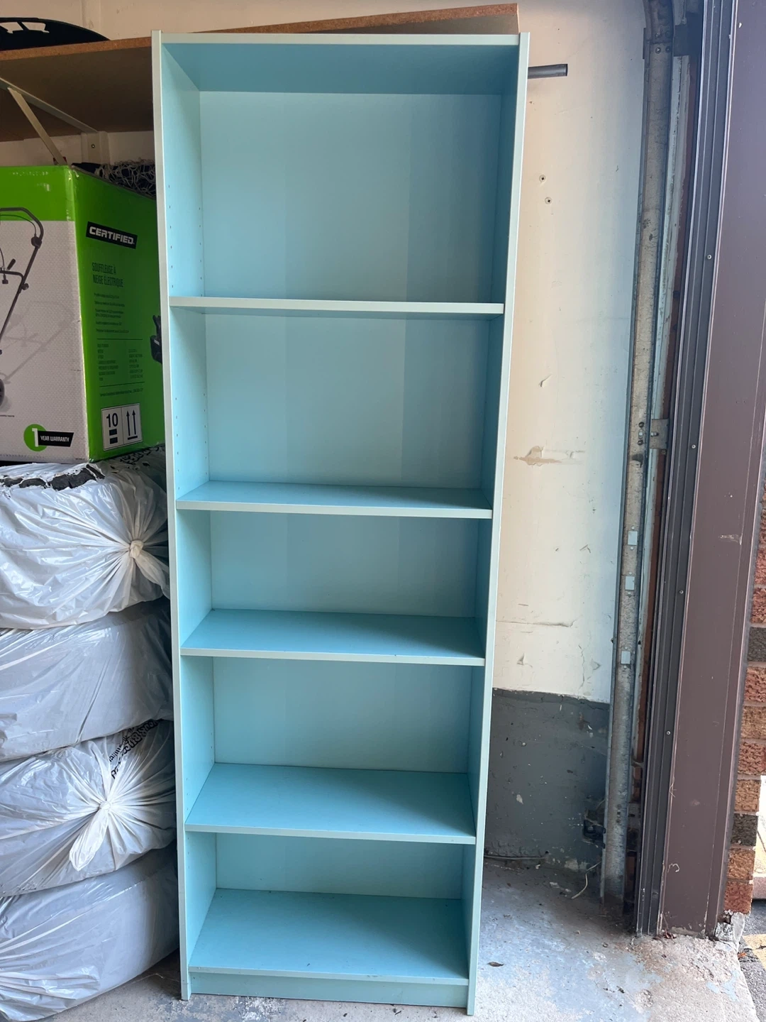 Selling a light blue bookshelf. It has five shelves and is perfect for storing books or other items. There is some damage on the side, as shown in the pictures.