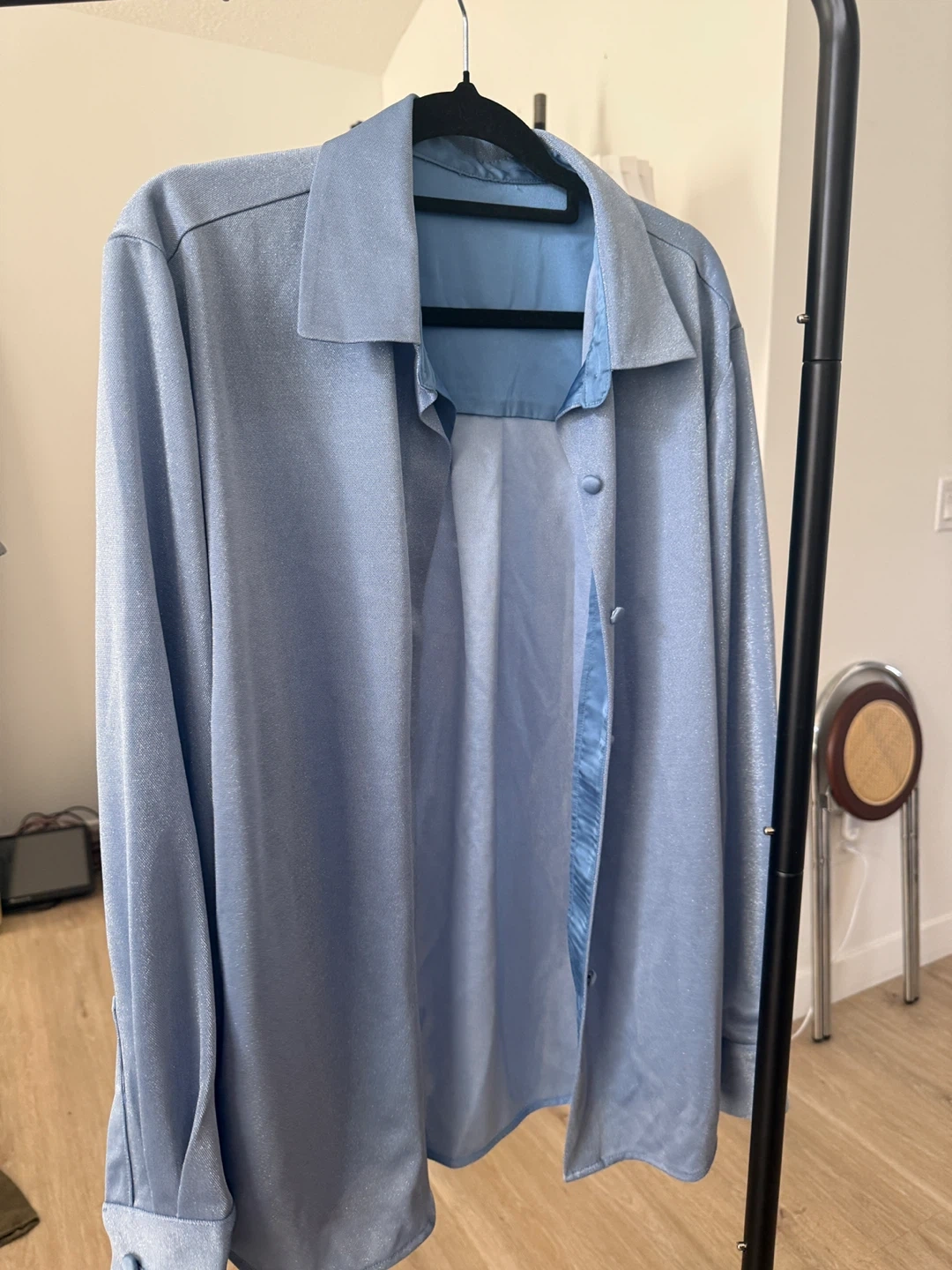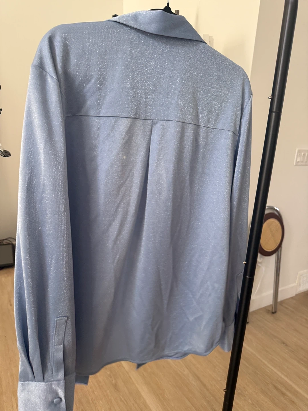 Here's a light blue button-down shirt that's looking for a new home! It's in great condition and ready to wear. The material has a slight sheen to it, adding a touch of style to any outfit