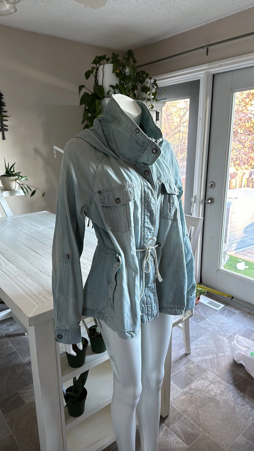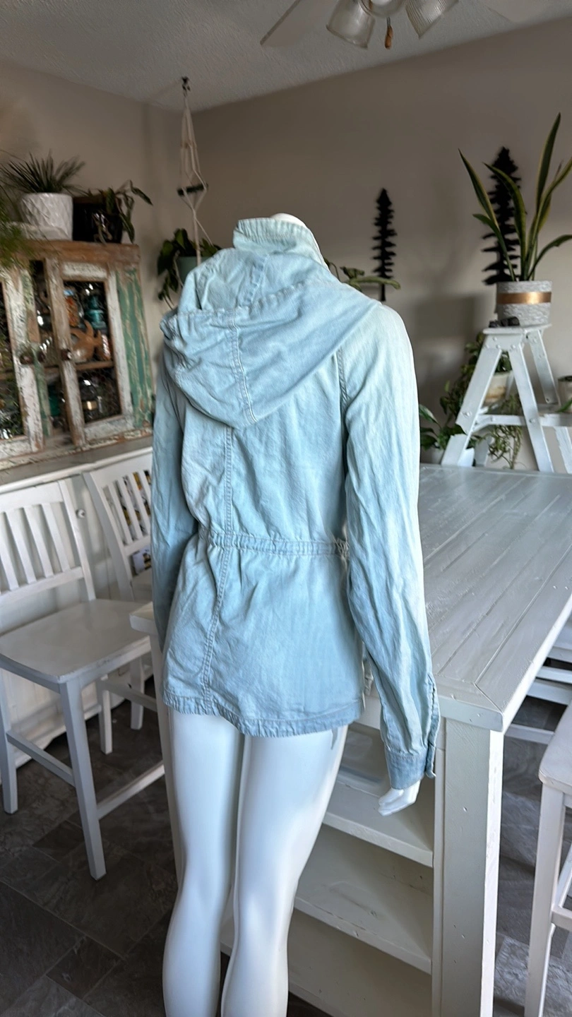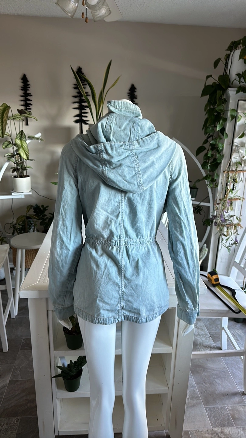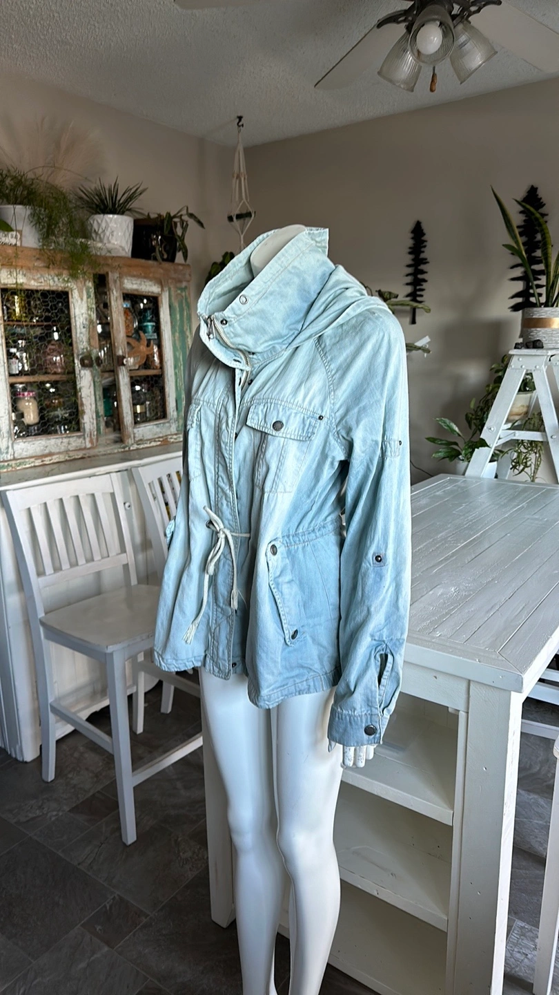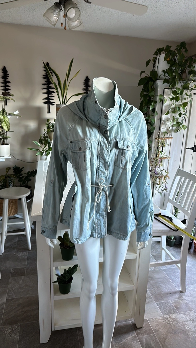 10Light blue denim jacket with a hood. Has a drawstring at the waist. Long sleeves. Pockets on the front.