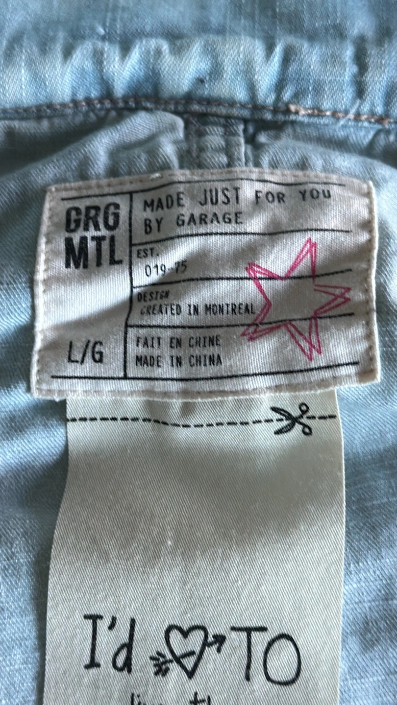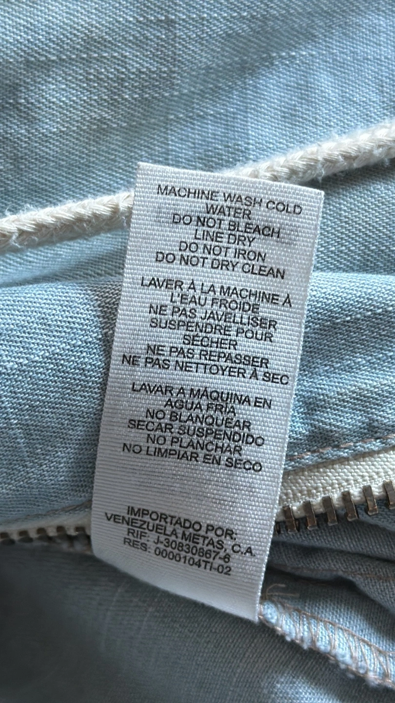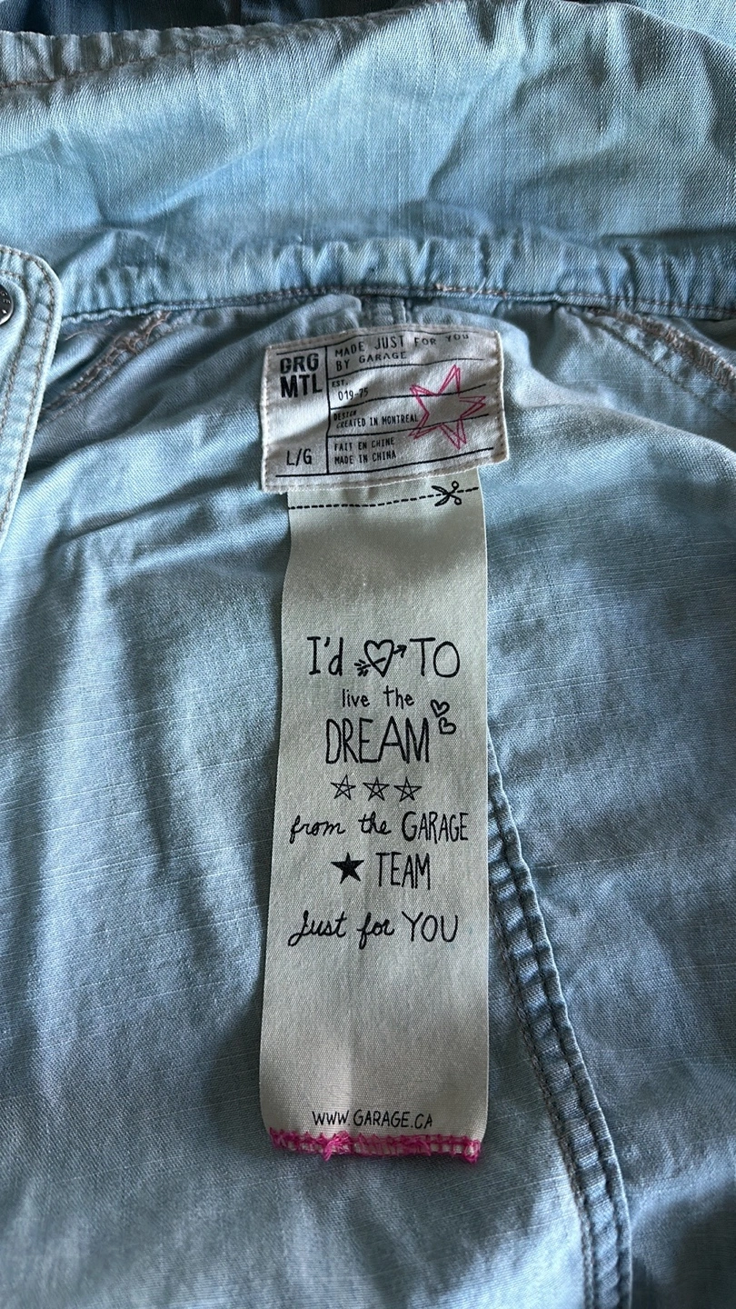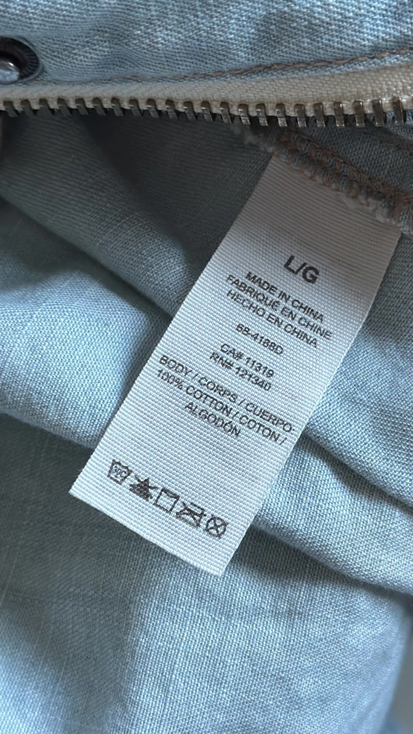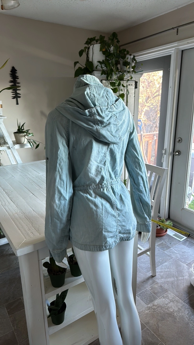 10Light blue denim jacket with a hood. Has a drawstring at the waist. Long sleeves. Pockets on the front.
