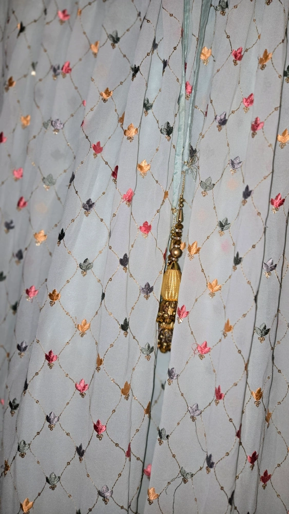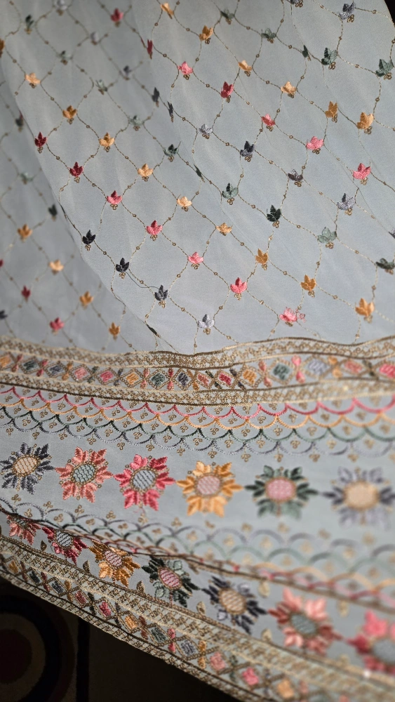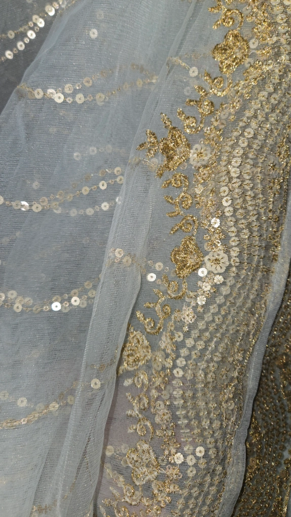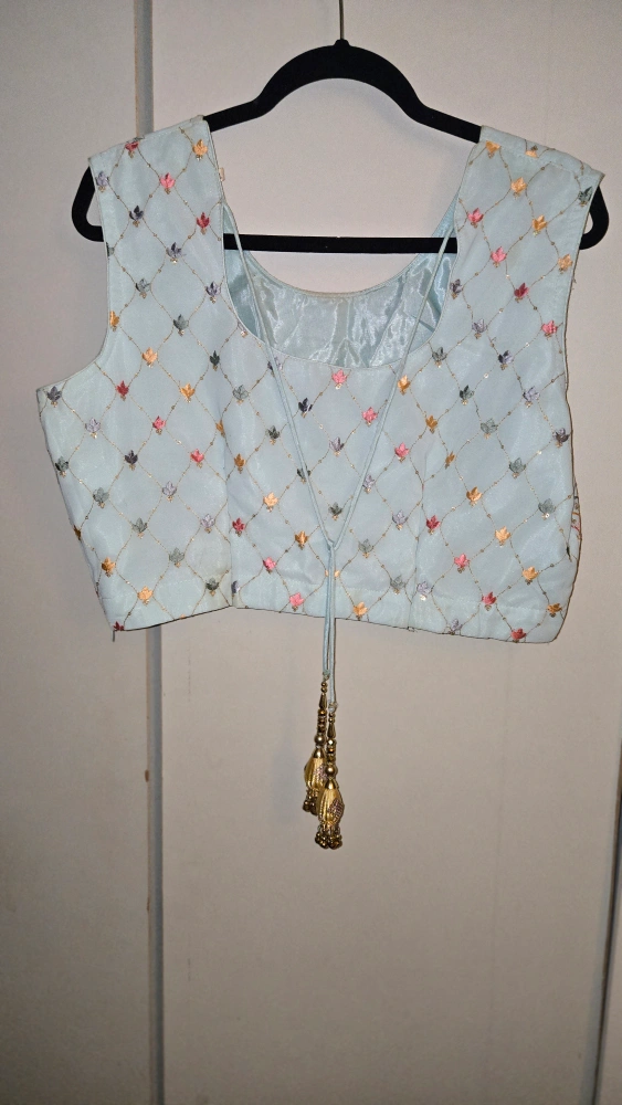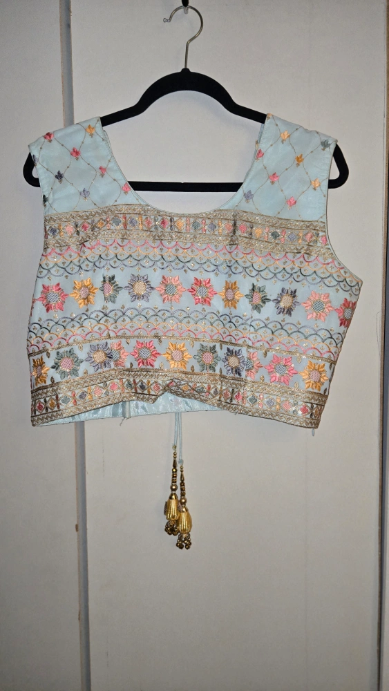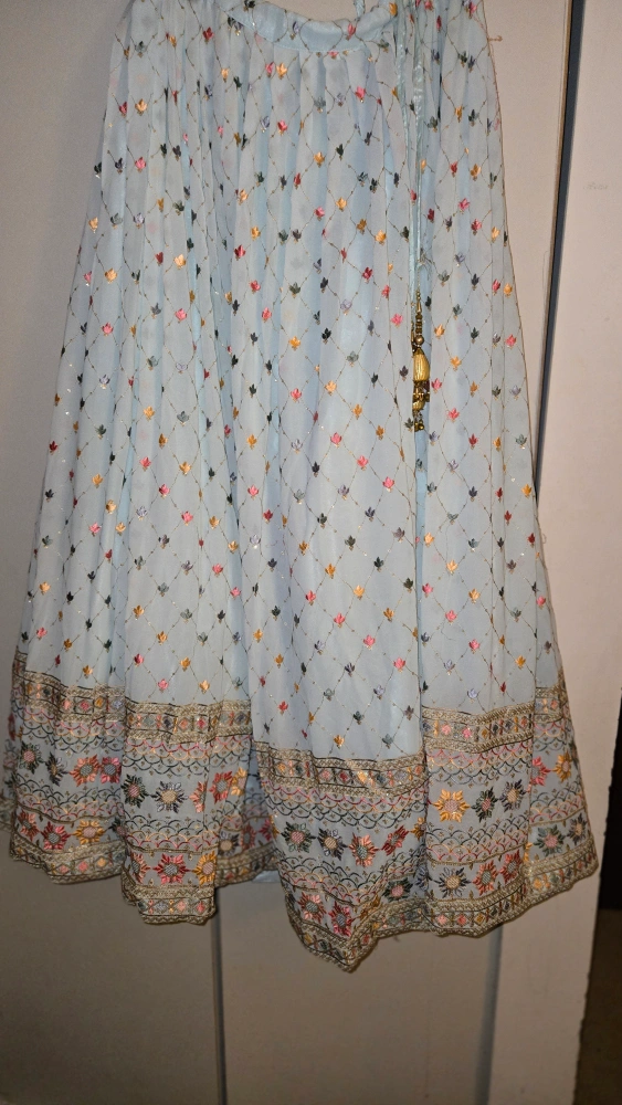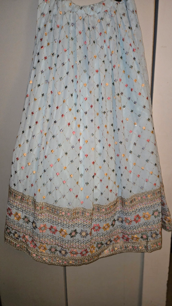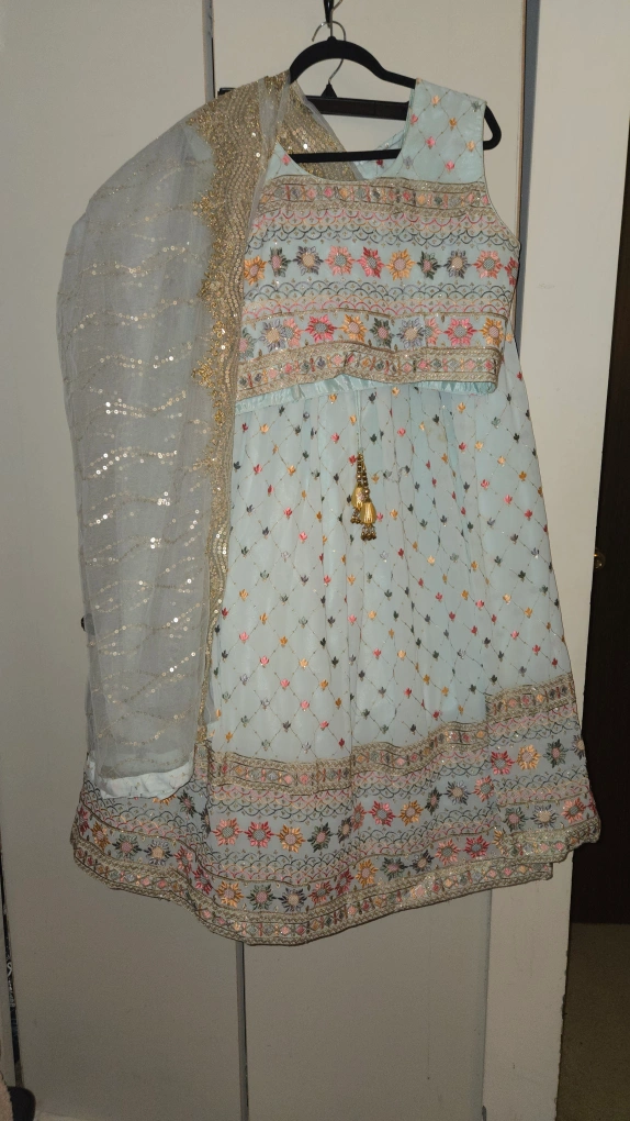 Light blue Indian suit set with a matching dupatta. Comes with a choli and skirt, both with embroidered details and a delicate floral pattern. Skirt has drawstring and is adjustable, with petticoat underneath to keep its A-line shape. Top can be worn for busts up to 38D. Perfect for women size 8-14. Very flattering! Open to fair offers.