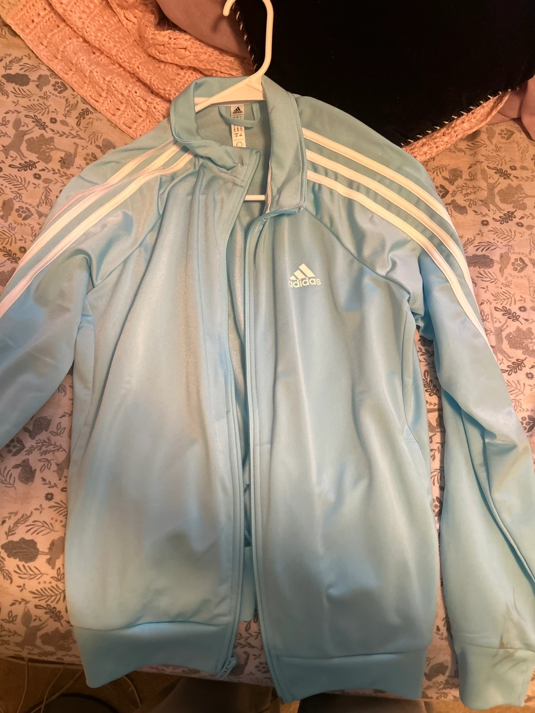 39Selling a light blue Adidas track jacket in women's size large. It's in great condition and ready for a new home! Only worn twice