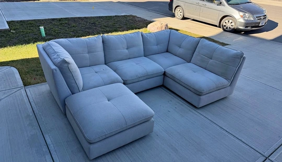 Selling a comfy light blue sectional sofa. It's in great condition and ready for a new home! Perfect for a living room or entertainment space, this sectional offers plenty of seating and a stylish look. delivery is available for extra