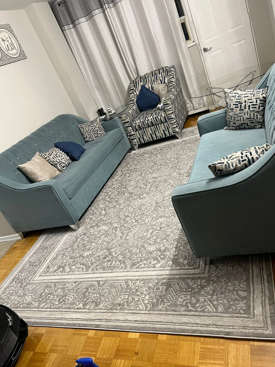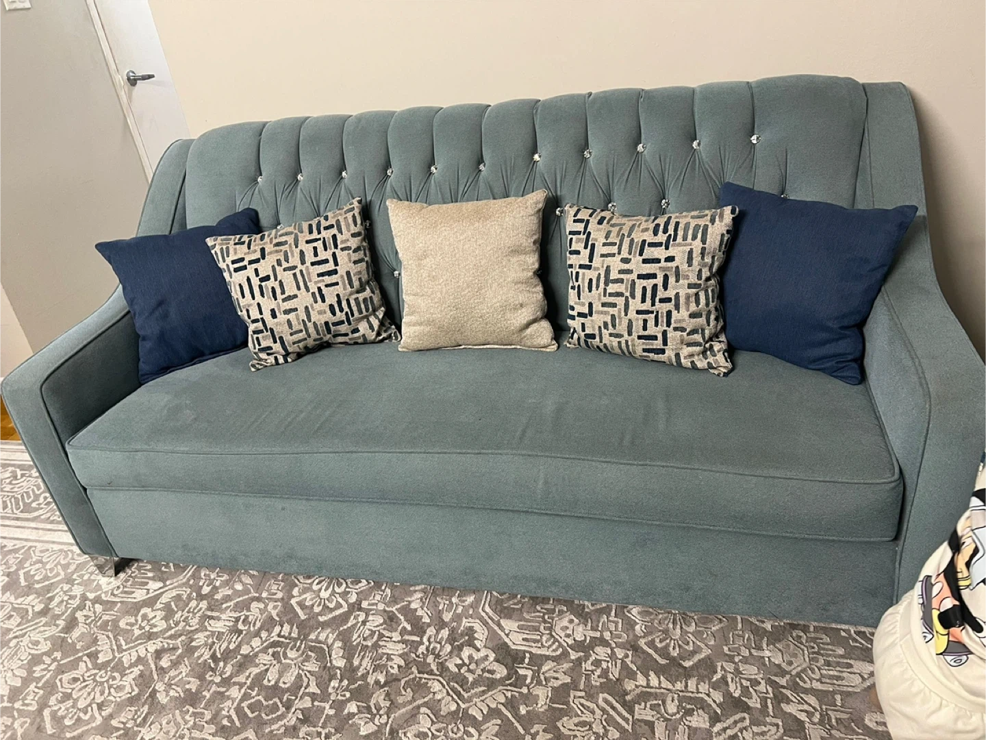 41Selling a lovely light blue tufted sofa and matching armchair set! The set is in great condition and would look beautiful in any living room or sitting area. The tufted detailing adds a touch of elegance and the light blue colour is very calming and neutral. Comes with decorative pillows as shown in the photos