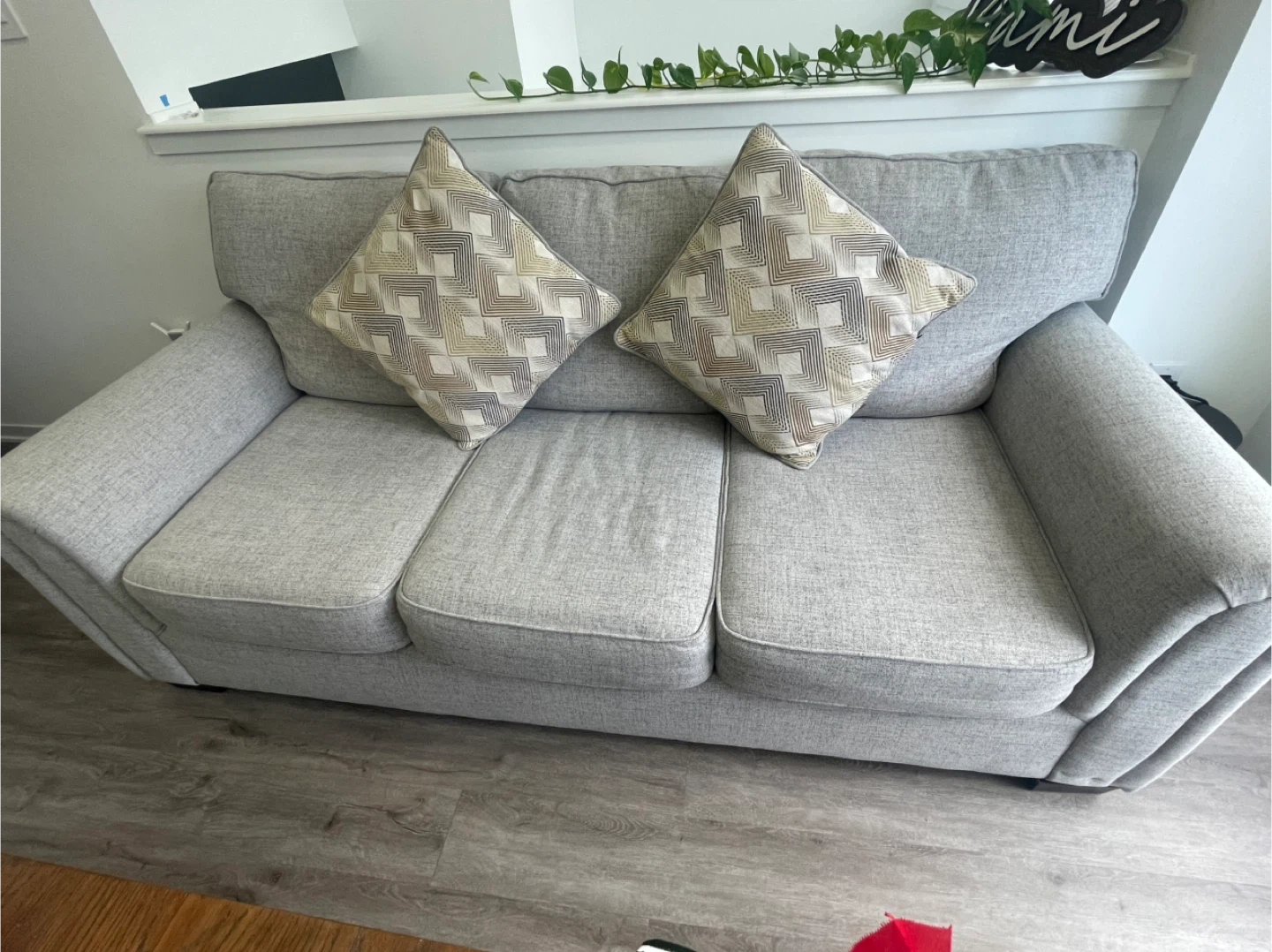 Selling a gently used light gray sofa. It's in good condition and ready for a new home! The sofa comes with the pillows shown in the pictures. It's a comfortable and stylish piece that would fit well in any living room. 1 year old couch. No stains, no marks, no tears, no damage, no color fading. Depth 38” , Height 36”, width 83”. If the listing is up then it’s available.