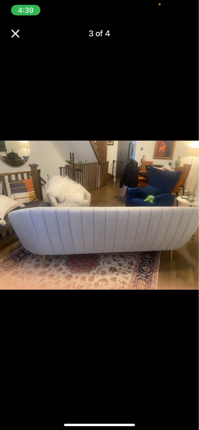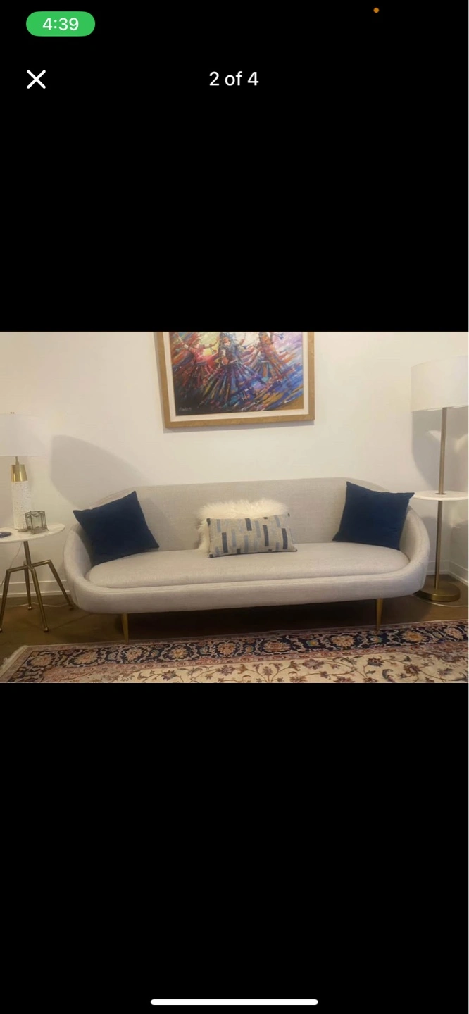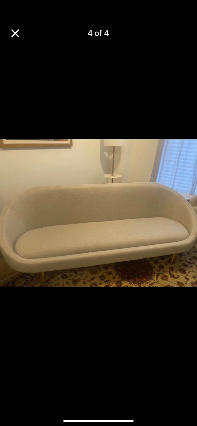 97Stylish light grey fabric sofa. Curved design, gold-toned legs. Comfortable seating. Perfect for a modern living room.selling as I am moving payed 3000$ for it .