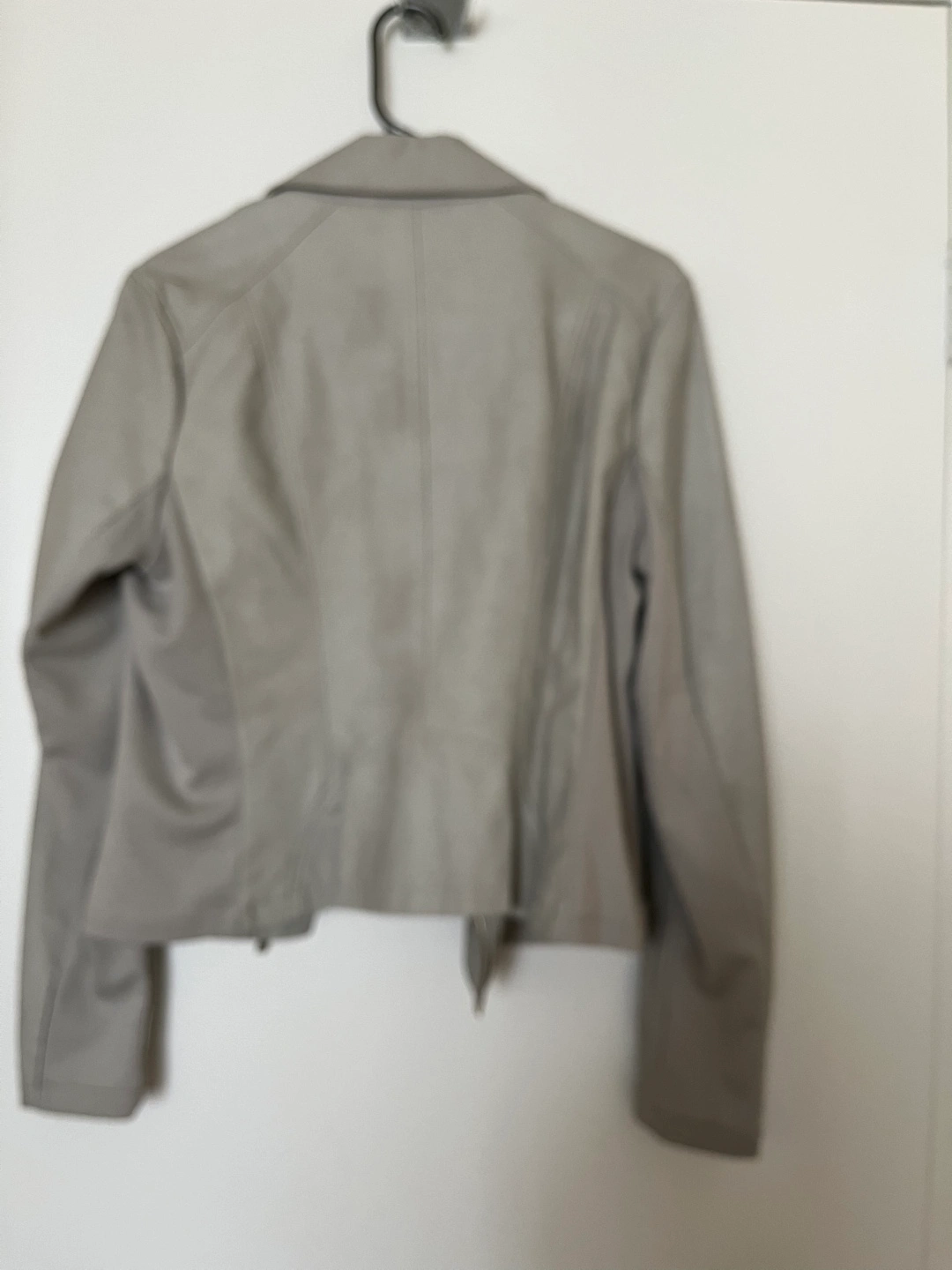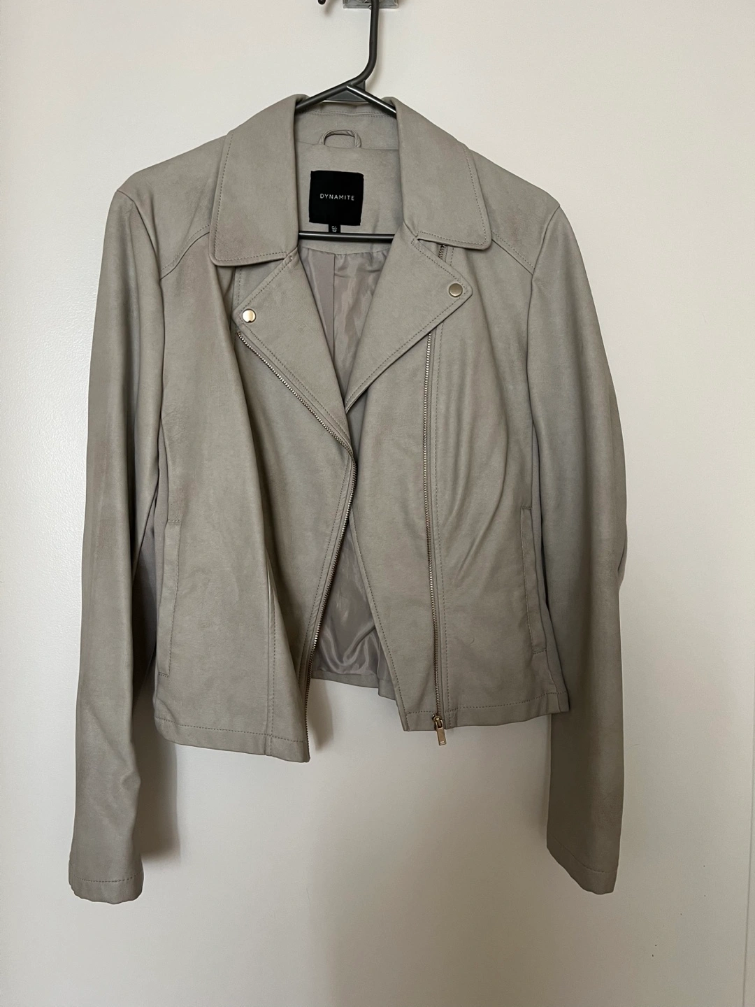 73Women's size small light grey faux leather moto jacket. Asymmetrical zipper closure. Long sleeves. Cropped length.