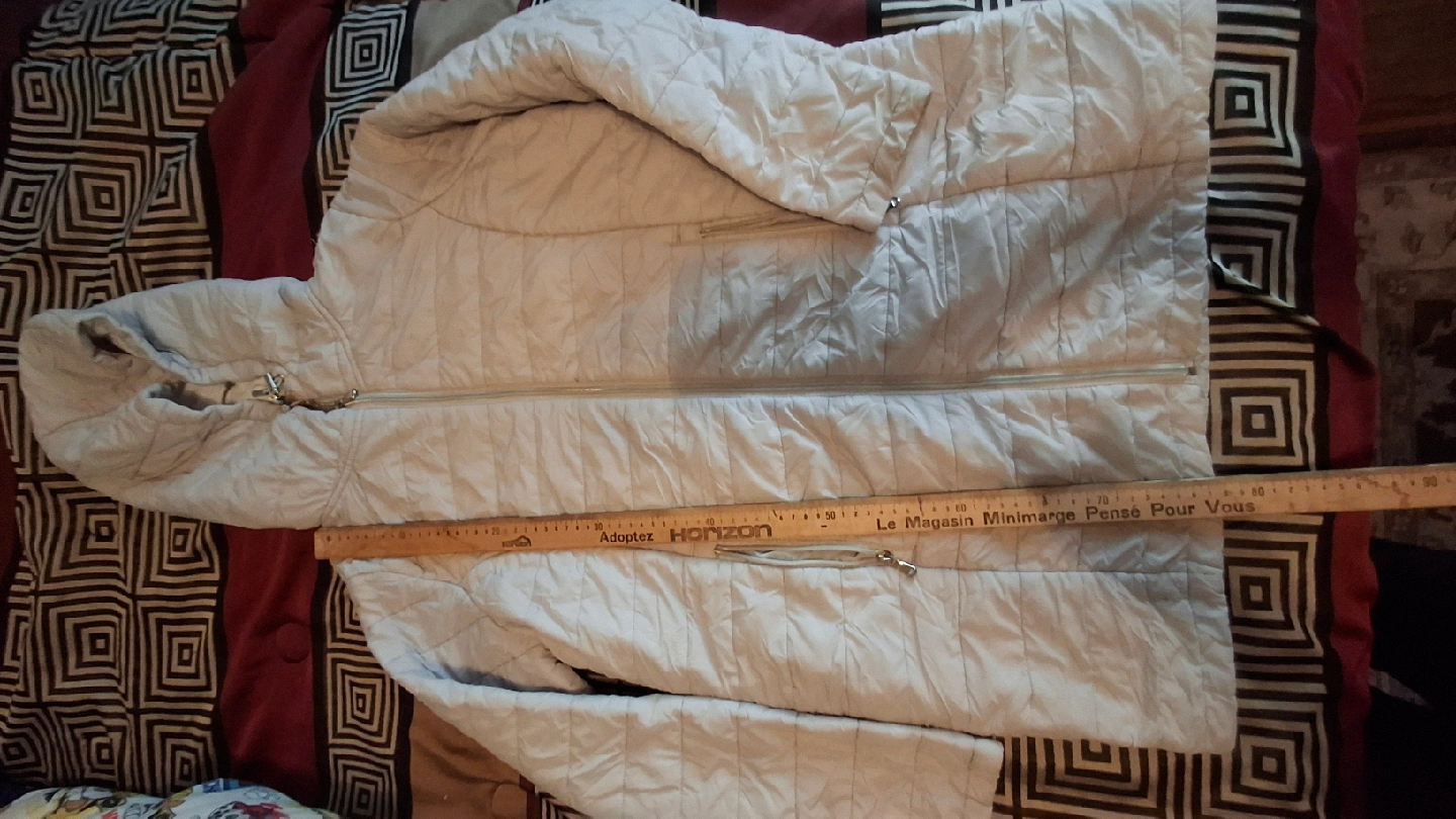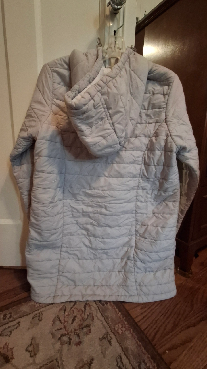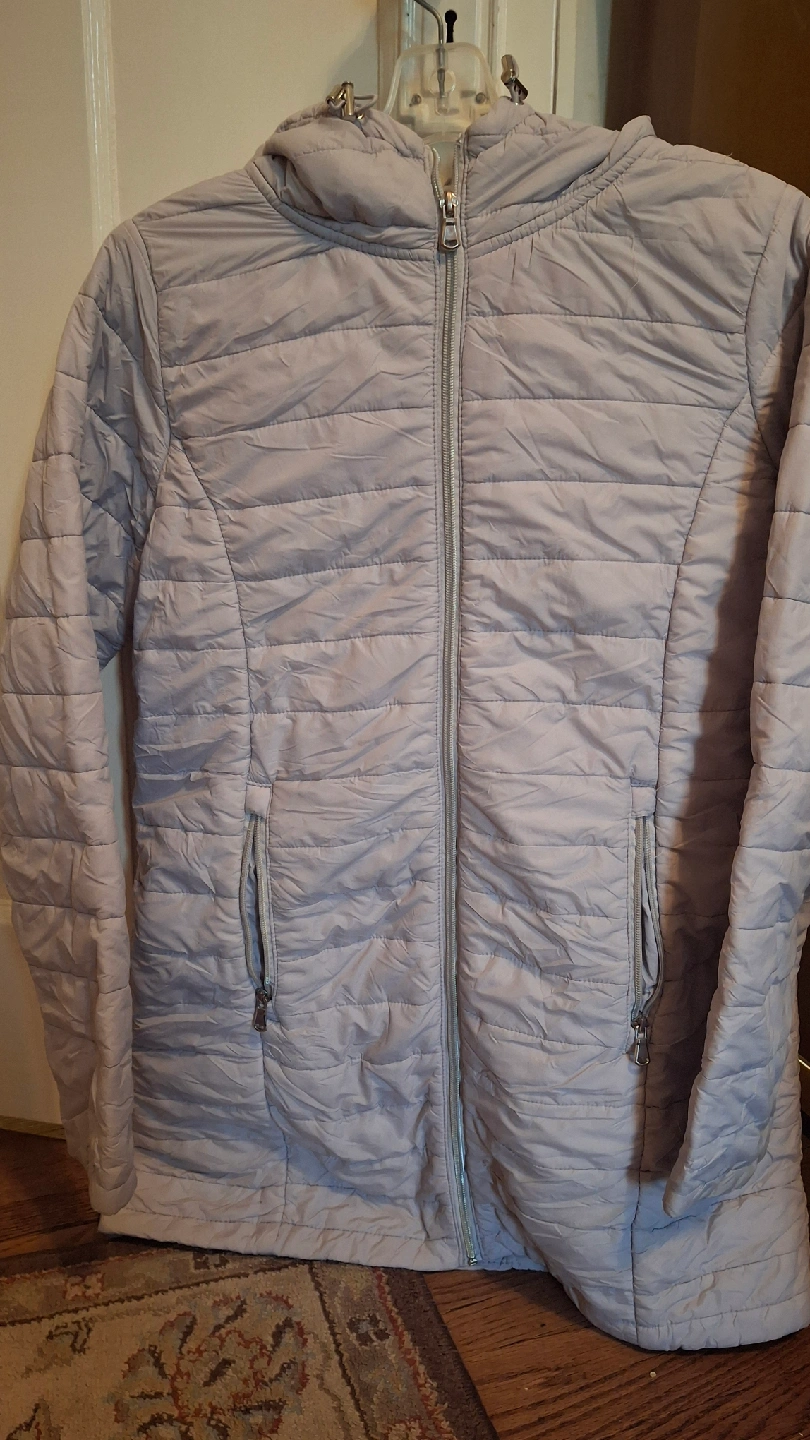 Selling a light grey puffer jacket! It's in great condition. It has a hood and zippered pockets.