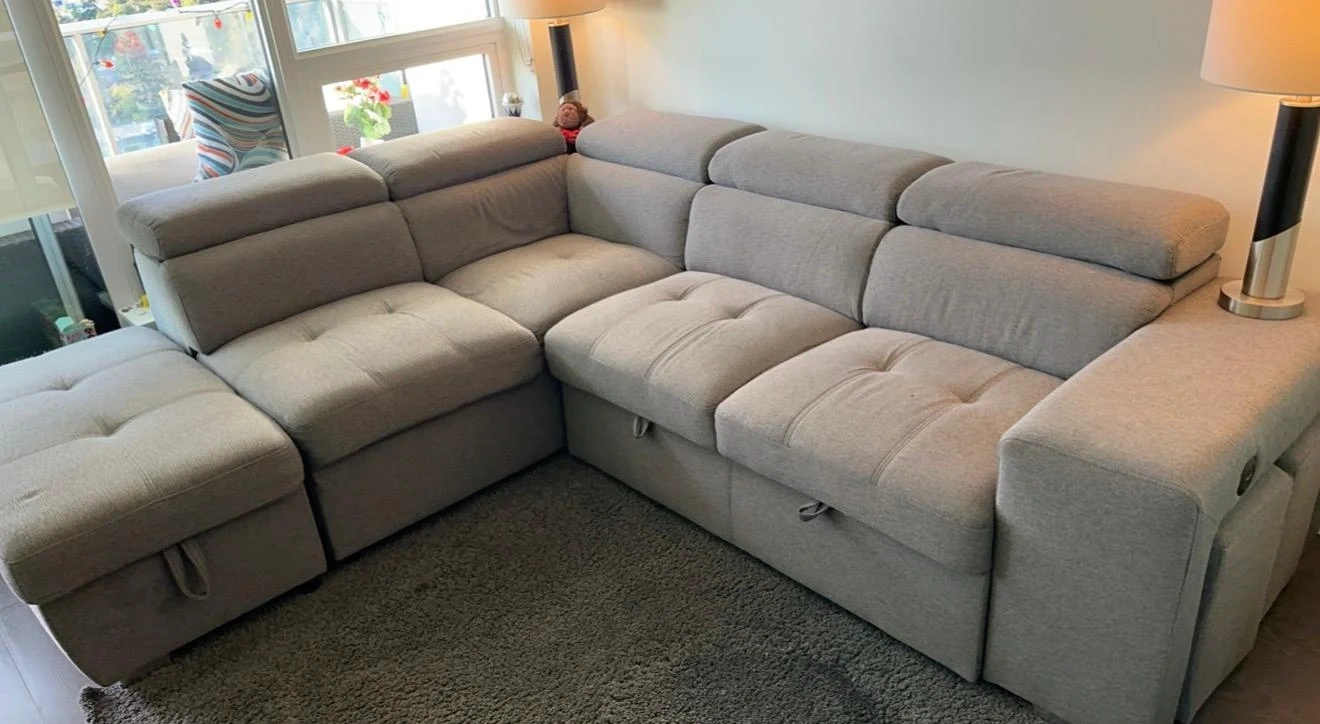 102Selling a comfortable light grey sectional sofa with an ottoman. It's in great condition and would be a lovely addition to any living room. The sectional includes a convenient storage area under the seats. Perfect for relaxing and enjoying your favourite shows. Also can be used to sleep on when having guest over. If needed to be delivered we can get that arranged too.