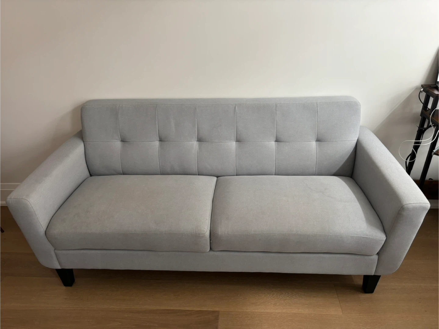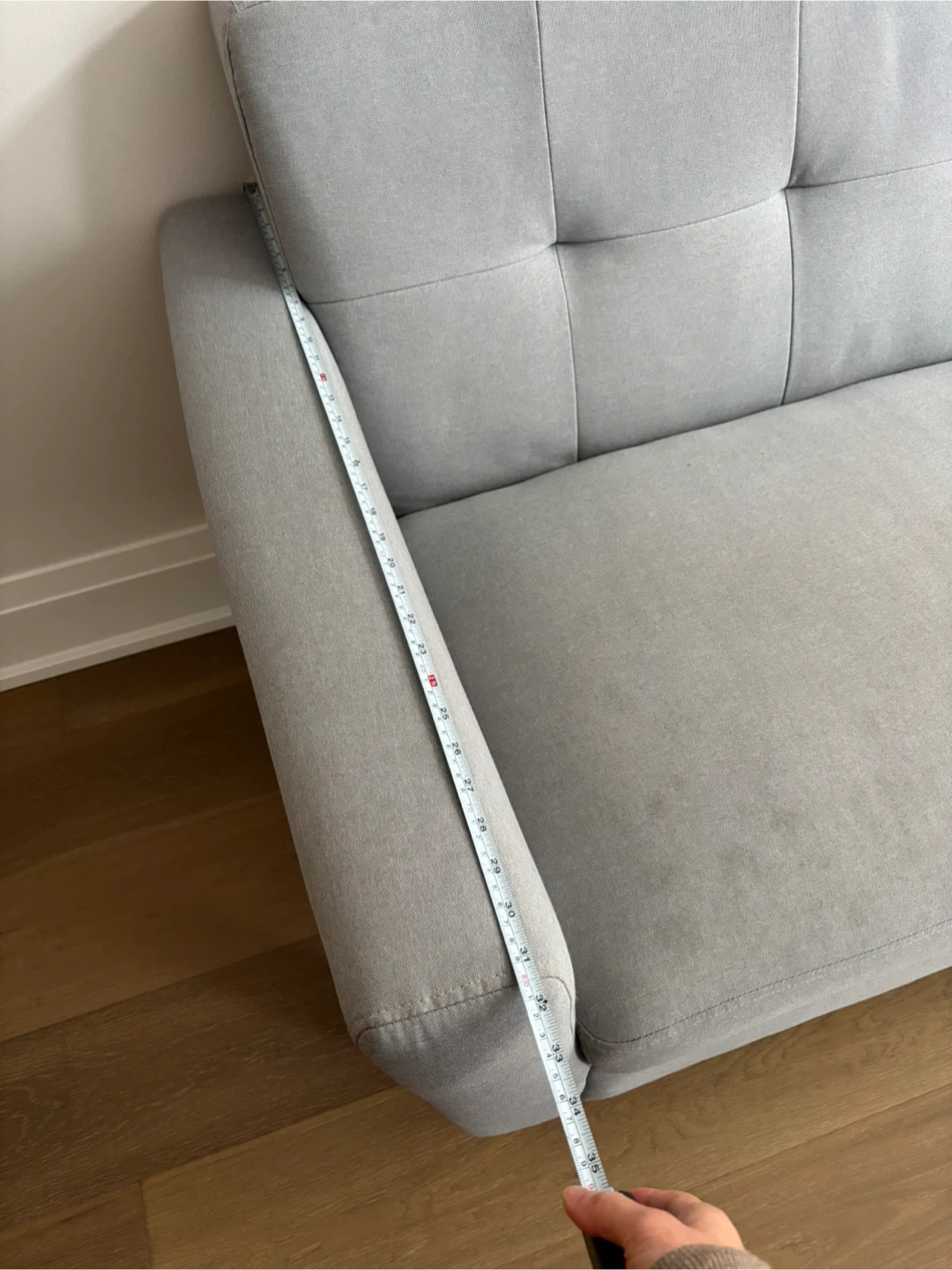 22Dimensions - see photos for details. Some stains from drink spills, but all the seat cushions still have excellent support. Pick up in Corktown near Queen East and Sumach. We have a non-shedding dog for 2 months with this couch. Otherwise this couch has never been in any space with any other animals.