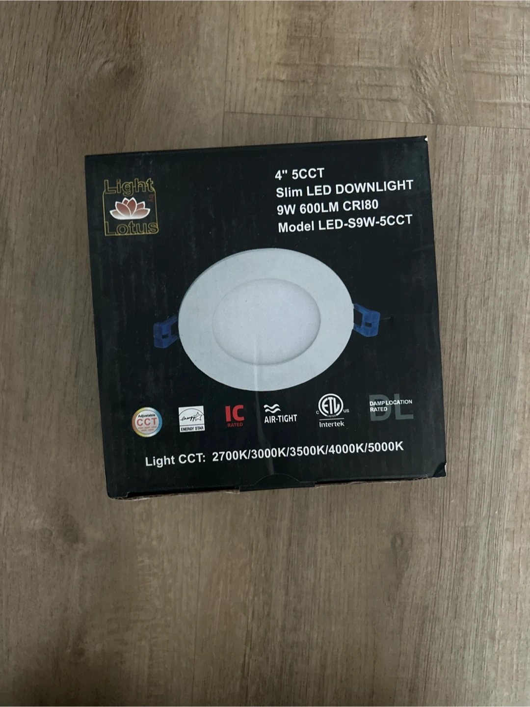 Selling a brand new Light Lotus 4" Slim LED Downlight, still in its original packaging! This downlight is a 4" 5CCT model, offering adjustable light CCT from 2700K to 5000K. It's a 9W, 600LM CR180 light, model LED-S9W-5CCT. It is IC rated, air-tight, and suitable for damp locations. Perfect for any room!