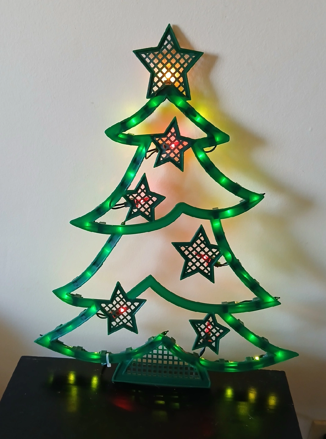 45Get ready for the holidays with this cute lighted Christmas tree decoration! It features a green frame with star accents and lights, perfect for adding a festive touch to any room