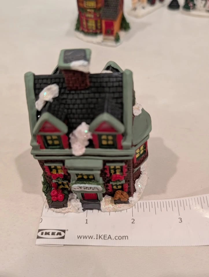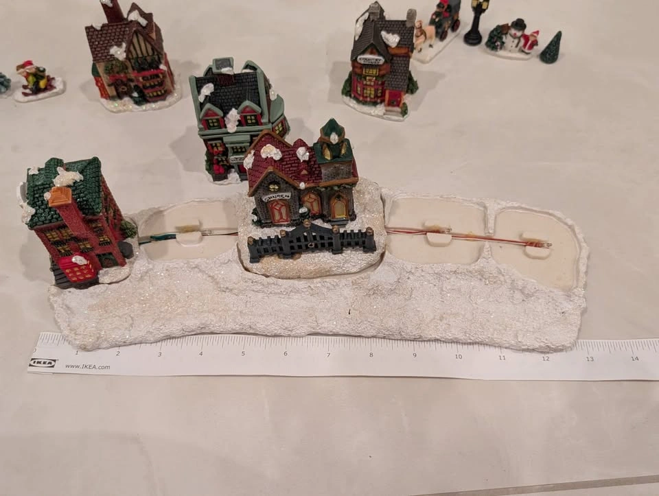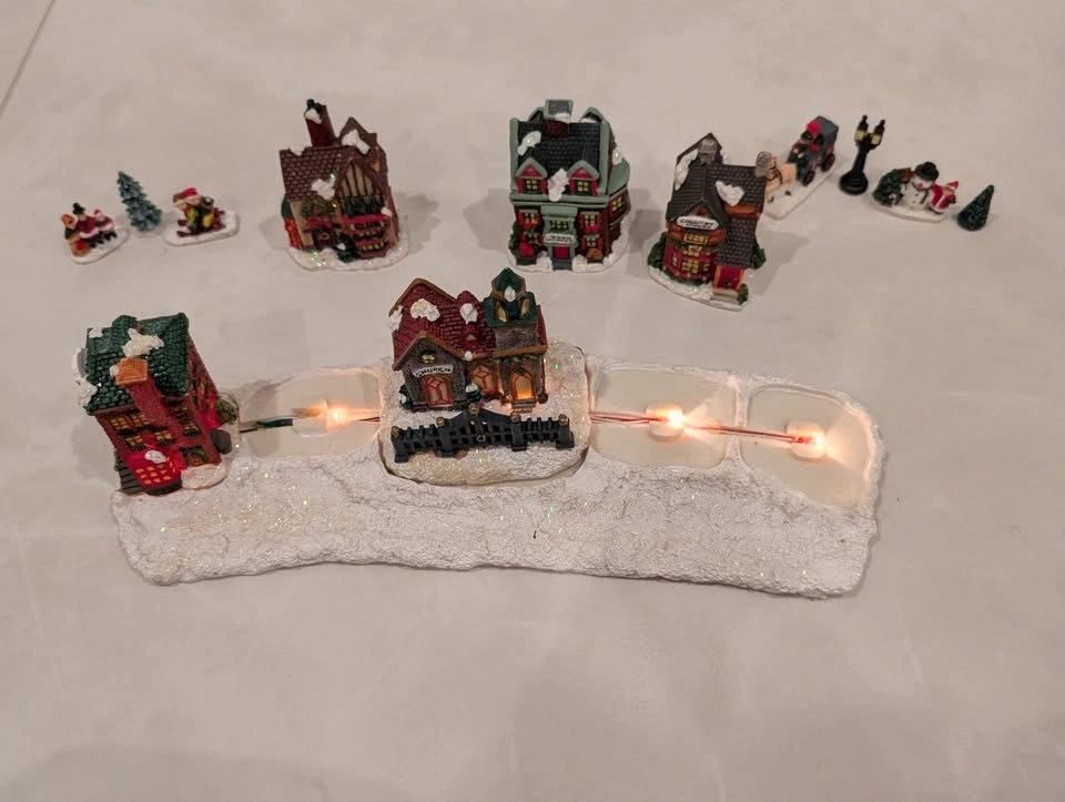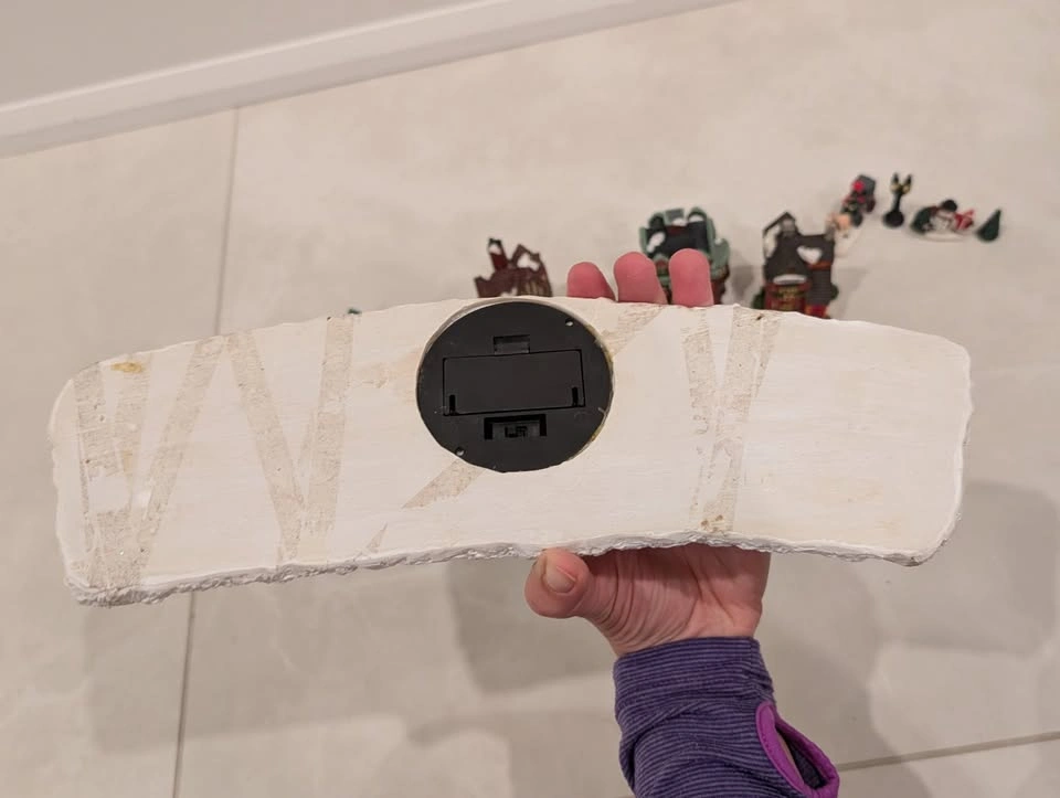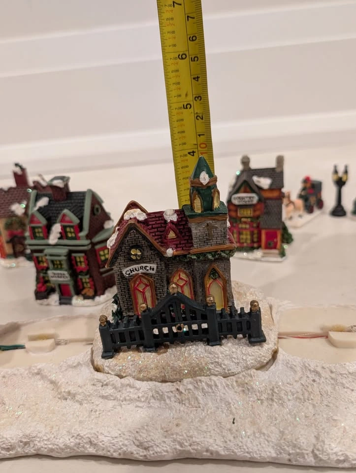 Uses AAA battery- batteries not included. Please note: There are tape marks on the bottom. There is wear to the buildings and glue marks where the buildings connect to the snow platform.